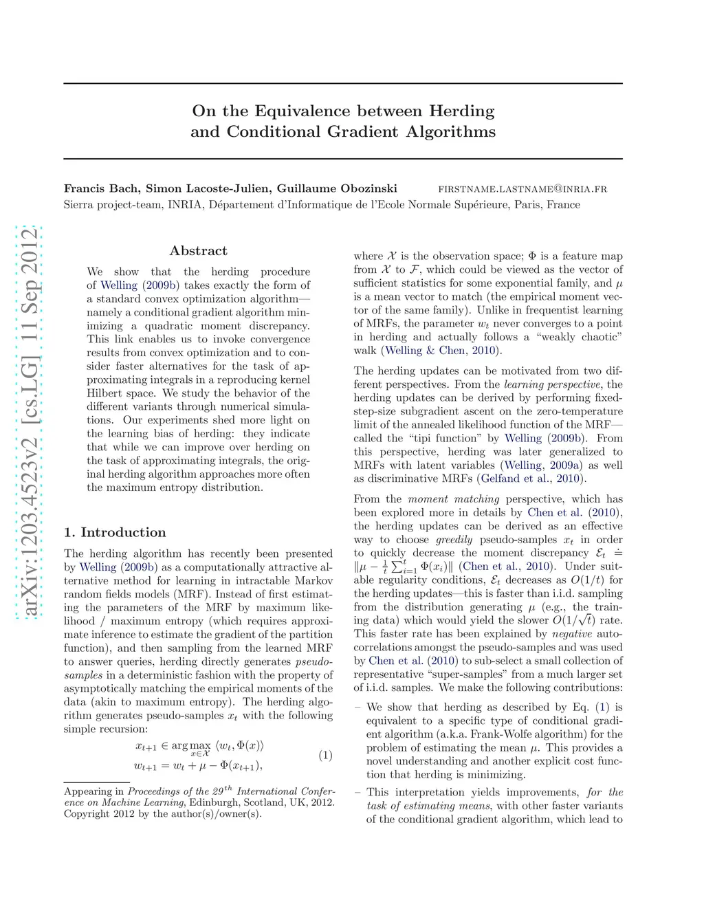 We show that the herding procedure of Welling (2009) takes exactly the form of a standard convex optimization algorithm--namely a conditional gradient algorithm minimizing a quadratic moment discrepancy. This link enables us to invoke convergence results from convex optimization and to consider faster alternatives for the task of approximating integrals in a reproducing kernel Hilbert space. We study the behavior of the different variants through numerical simulations. The experiments indicate that while we can improve over herding on the task of approximating integrals, the original herding algorithm tends to approach more often the maximum entropy distribution, shedding more light on the learning bias behind herding.