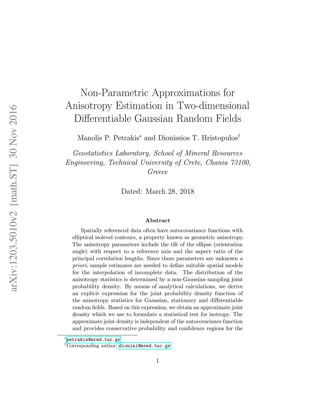 Spatially referenced data often have autocovariance functions with elliptical isolevel contours, a property known as geometric anisotropy. The anisotropy parameters include the tilt of the ellipse (orientation angle) with respect to a reference axis and the aspect ratio of the principal correlation lengths. Since these parameters are unknown a priori, sample estimates are needed to define suitable spatial models for the interpolation of incomplete data. The distribution of the anisotropy statistics is determined by a non-Gaussian sampling joint probability density. By means of analytical calculations, we derive an explicit expression for the joint probability density function of the anisotropy statistics for Gaussian, stationary and differentiable random fields. Based on this expression, we obtain an approximate joint density which we use to formulate a statistical test for isotropy. The approximate joint density is independent of the autocovariance function and provides conservative probability and confidence regions for the anisotropy parameters. We validate the theoretical analysis by means of simulations using synthetic data, and we illustrate the detection of anisotropy changes with a case study involving background radiation exposure data. The approximate joint density provides (i) a stand-alone approximate estimate of the anisotropy statistics distribution (ii) informed initial values for maximum likelihood estimation, and (iii) a useful prior for Bayesian anisotropy inference.