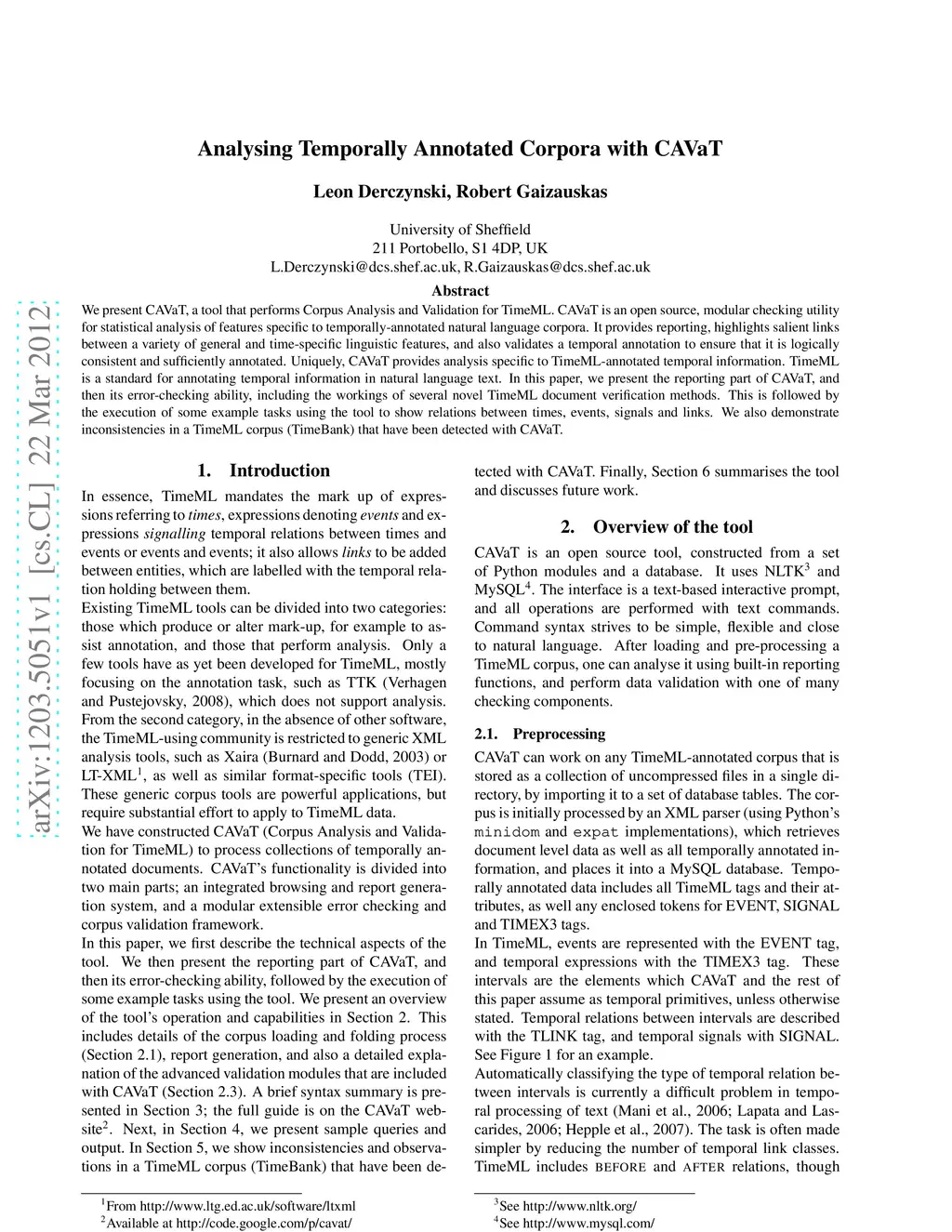 We present CAVaT, a tool that performs Corpus Analysis and Validation for TimeML. CAVaT is an open source, modular checking utility for statistical analysis of features specific to temporally-annotated natural language corpora. It provides reporting, highlights salient links between a variety of general and time-specific linguistic features, and also validates a temporal annotation to ensure that it is logically consistent and sufficiently annotated. Uniquely, CAVaT provides analysis specific to TimeML-annotated temporal information. TimeML is a standard for annotating temporal information in natural language text. In this paper, we present the reporting part of CAVaT, and then its error-checking ability, including the workings of several novel TimeML document verification methods. This is followed by the execution of some example tasks using the tool to show relations between times, events, signals and links. We also demonstrate inconsistencies in a TimeML corpus (TimeBank) that have been detected with CAVaT.