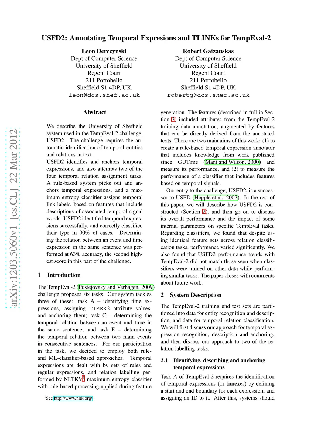 We describe the University of Sheffield system used in the TempEval-2 challenge, USFD2. The challenge requires the automatic identification of temporal entities and relations in text. USFD2 identifies and anchors temporal expressions, and also attempts two of the four temporal relation assignment tasks. A rule-based system picks out and anchors temporal expressions, and a maximum entropy classifier assigns temporal link labels, based on features that include descriptions of associated temporal signal words. USFD2 identified temporal expressions successfully, and correctly classified their type in 90% of cases. Determining the relation between an event and time expression in the same sentence was performed at 63% accuracy, the second highest score in this part of the challenge.