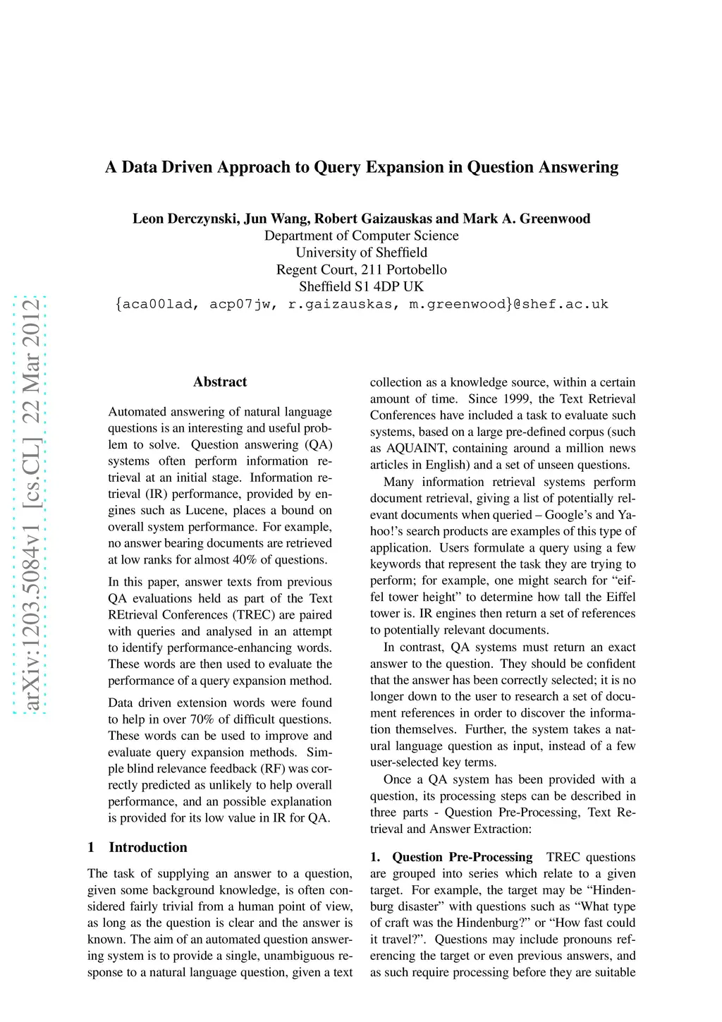 A Data Driven Approach to Query Expansion in Question Answering