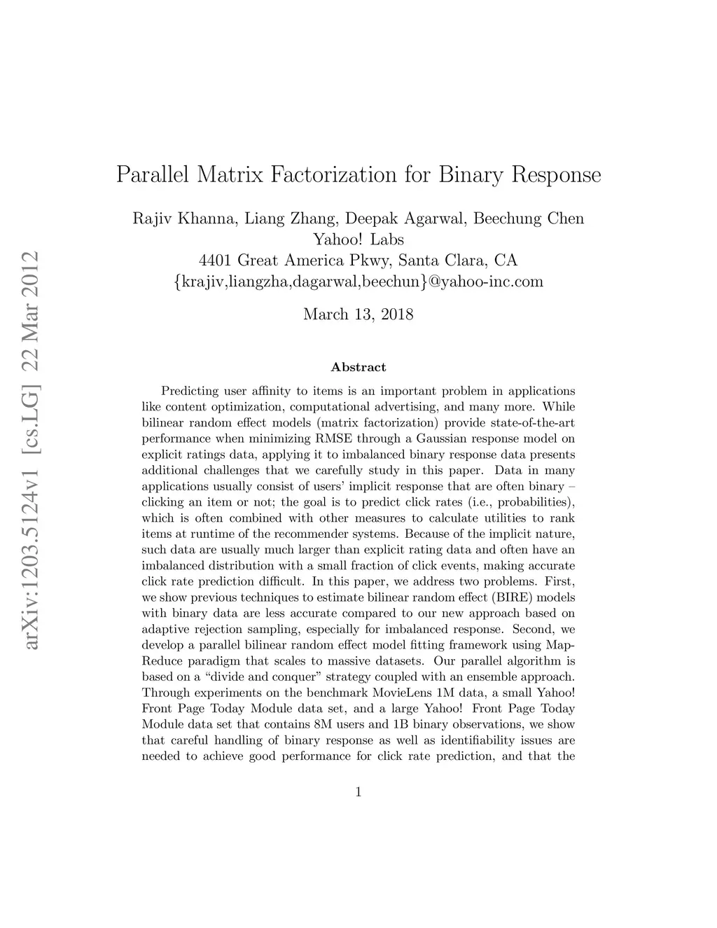 Predicting user affinity to items is an important problem in applications like content optimization, computational advertising, and many more. While bilinear random effect models (matrix factorization) provide state-of-the-art performance when minimizing RMSE through a Gaussian response model on explicit ratings data, applying it to imbalanced binary response data presents additional challenges that we carefully study in this paper. Data in many applications usually consist of users' implicit response that are often binary -- clicking an item or not; the goal is to predict click rates, which is often combined with other measures to calculate utilities to rank items at runtime of the recommender systems. Because of the implicit nature, such data are usually much larger than explicit rating data and often have an imbalanced distribution with a small fraction of click events, making accurate click rate prediction difficult. In this paper, we address two problems. First, we show previous techniques to estimate bilinear random effect models with binary data are less accurate compared to our new approach based on adaptive rejection sampling, especially for imbalanced response. Second, we develop a parallel bilinear random effect model fitting framework using Map-Reduce paradigm that scales to massive datasets. Our parallel algorithm is based on a "divide and conquer" strategy coupled with an ensemble approach. Through experiments on the benchmark MovieLens data, a small Yahoo! Front Page data set, and a large Yahoo! Front Page data set that contains 8M users and 1B binary observations, we show that careful handling of binary response as well as identifiability issues are needed to achieve good performance for click rate prediction, and that the proposed adaptive rejection sampler and the partitioning as well as ensemble techniques significantly improve model performance.