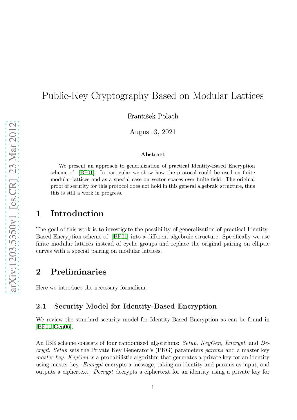 We present an approach to generalization of practical Identity-Based Encryption scheme of Boneh and Franklin. In particular we show how the protocol could be used on finite modular lattices and as a special case on vector spaces over finite field. The original proof of security for this protocol does not hold in this general algebraic structure, thus this is still a work in progress.