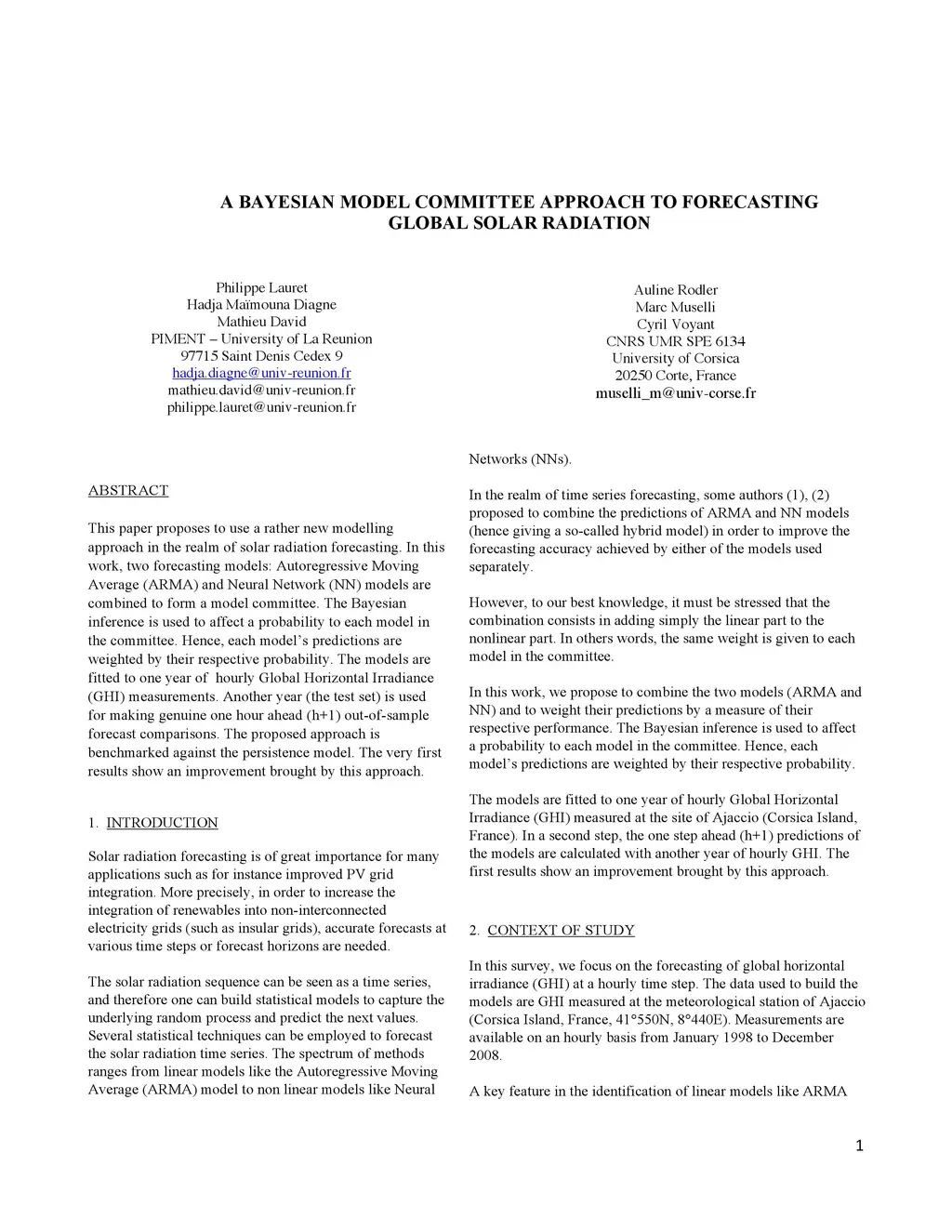 This paper proposes to use a rather new modelling approach in the realm of solar radiation forecasting. In this work, two forecasting models: Autoregressive Moving Average (ARMA) and Neural Network (NN) models are combined to form a model committee. The Bayesian inference is used to affect a probability to each model in the committee. Hence, each model's predictions are weighted by their respective probability. The models are fitted to one year of hourly Global Horizontal Irradiance (GHI) measurements. Another year (the test set) is used for making genuine one hour ahead (h+1) out-of-sample forecast comparisons. The proposed approach is benchmarked against the persistence model. The very first results show an improvement brought by this approach.