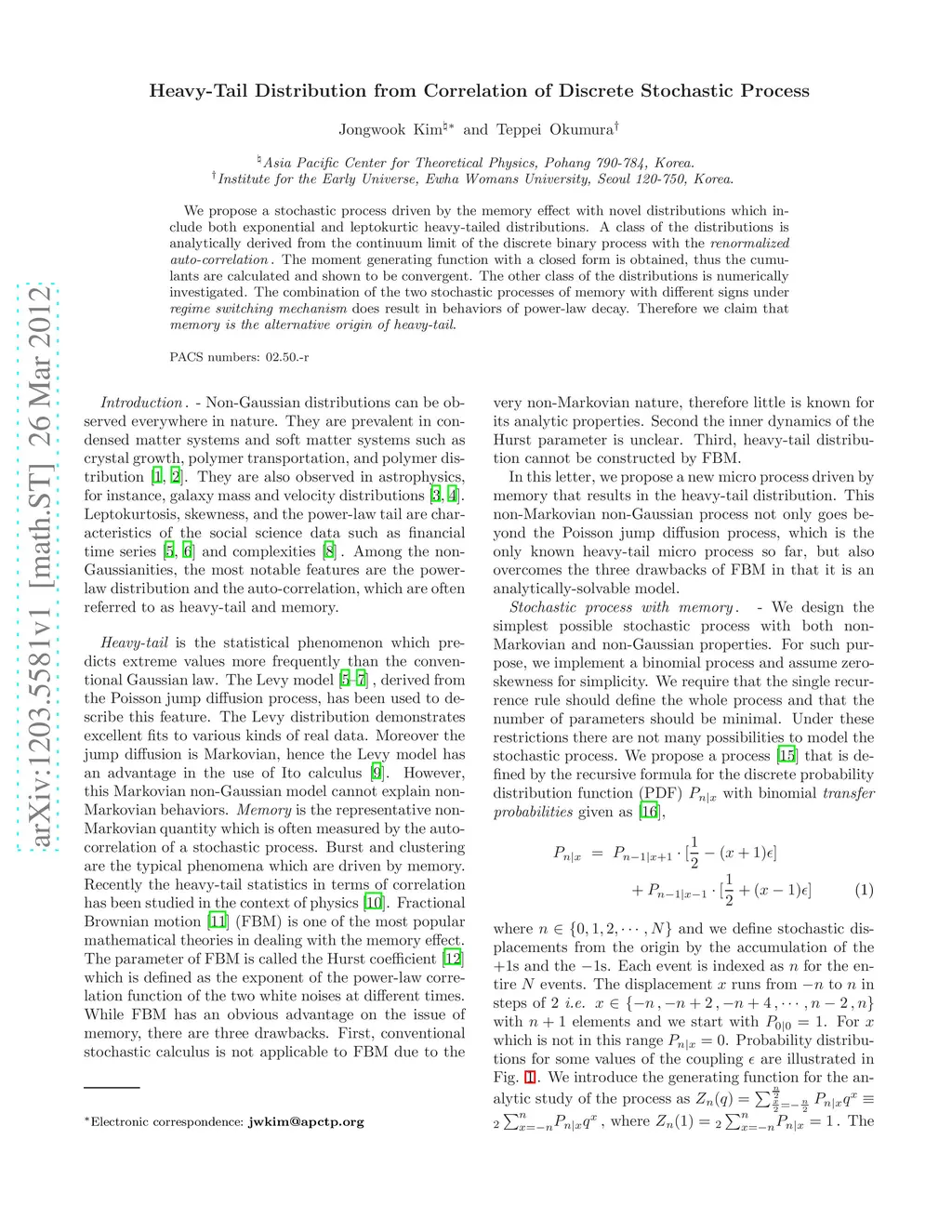 We propose a stochastic process driven by the memory effect with novel distributions which include both exponential and leptokurtic heavy-tailed distributions. A class of the distributions is analytically derived from the continuum limit of the discrete binary process with the renormalized auto-correlation. The moment generating function with a closed form is obtained, thus the cumulants are calculated and shown to be convergent. The other class of the distributions is numerically investigated. The combination of the two stochastic processes of memory with different signs under regime switching mechanism does result in behaviors of power-law decay. Therefore we claim that memory is the alternative origin of heavy-tail.