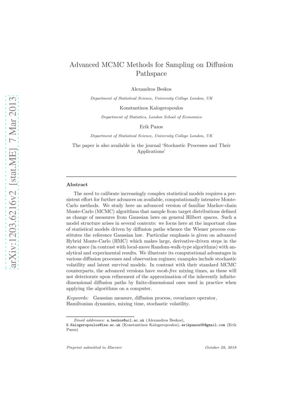 The need to calibrate increasingly complex statistical models requires a persistent effort for further advances on available, computationally intensive Monte Carlo methods. We study here an advanced version of familiar Markov Chain Monte Carlo (MCMC) algorithms that sample from target distributions defined as change of measures from Gaussian laws on general Hilbert spaces. Such a model structure arises in several contexts: we focus here at the important class of statistical models driven by diffusion paths whence the Wiener process constitutes the reference Gaussian law. Particular emphasis is given on advanced Hybrid Monte-Carlo (HMC) which makes large, derivative-driven steps in the state space (in contrast with local-move Random-walk-type algorithms) with analytical and experimental results. We illustrate it's computational advantages in various diffusion processes and observation regimes; examples include stochastic volatility and latent survival models. In contrast with their standard MCMC counterparts, the advanced versions have mesh-free mixing times, as these will not deteriorate upon refinement of the approximation of the inherently infinite-dimensional diffusion paths by finite-dimensional ones used in practice when applying the algorithms on a computer.