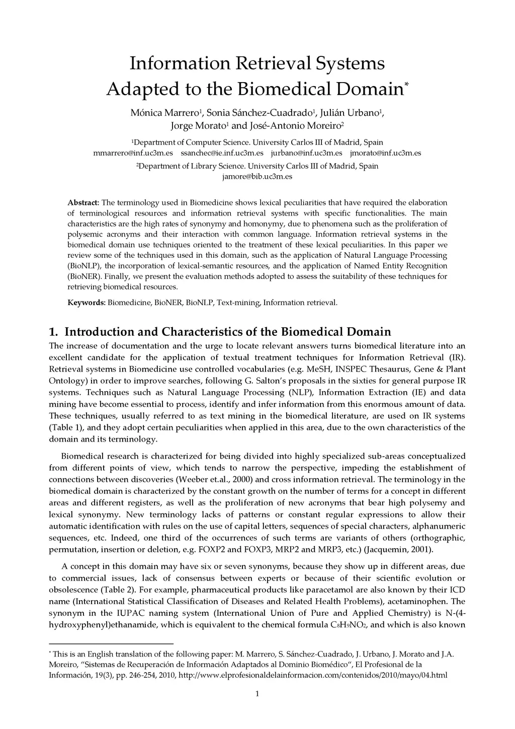 The terminology used in Biomedicine shows lexical peculiarities that have required the elaboration of terminological resources and information retrieval systems with specific functionalities. The main characteristics are the high rates of synonymy and homonymy, due to phenomena such as the proliferation of polysemic acronyms and their interaction with common language. Information retrieval systems in the biomedical domain use techniques oriented to the treatment of these lexical peculiarities. In this paper we review some of the techniques used in this domain, such as the application of Natural Language Processing (BioNLP), the incorporation of lexical-semantic resources, and the application of Named Entity Recognition (BioNER). Finally, we present the evaluation methods adopted to assess the suitability of these techniques for retrieving biomedical resources.