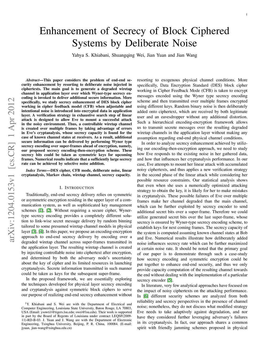 This paper considers the problem of end-end security enhancement by resorting to deliberate noise injected in ciphertexts. The main goal is to generate a degraded wiretap channel in application layer over which Wyner-type secrecy encoding is invoked to deliver additional secure information. More specifically, we study secrecy enhancement of DES block cipher working in cipher feedback model (CFB) when adjustable and intentional noise is introduced into encrypted data in application layer. A verification strategy in exhaustive search step of linear attack is designed to allow Eve to mount a successful attack in the noisy environment. Thus, a controllable wiretap channel is created over multiple frames by taking advantage of errors in Eve's cryptanalysis, whose secrecy capacity is found for the case of known channel states at receivers. As a result, additional secure information can be delivered by performing Wyner type secrecy encoding over super-frames ahead of encryption, namely, our proposed secrecy encoding-then-encryption scheme. These secrecy bits could be taken as symmetric keys for upcoming frames. Numerical results indicate that a sufficiently large secrecy rate can be achieved by selective noise addition.