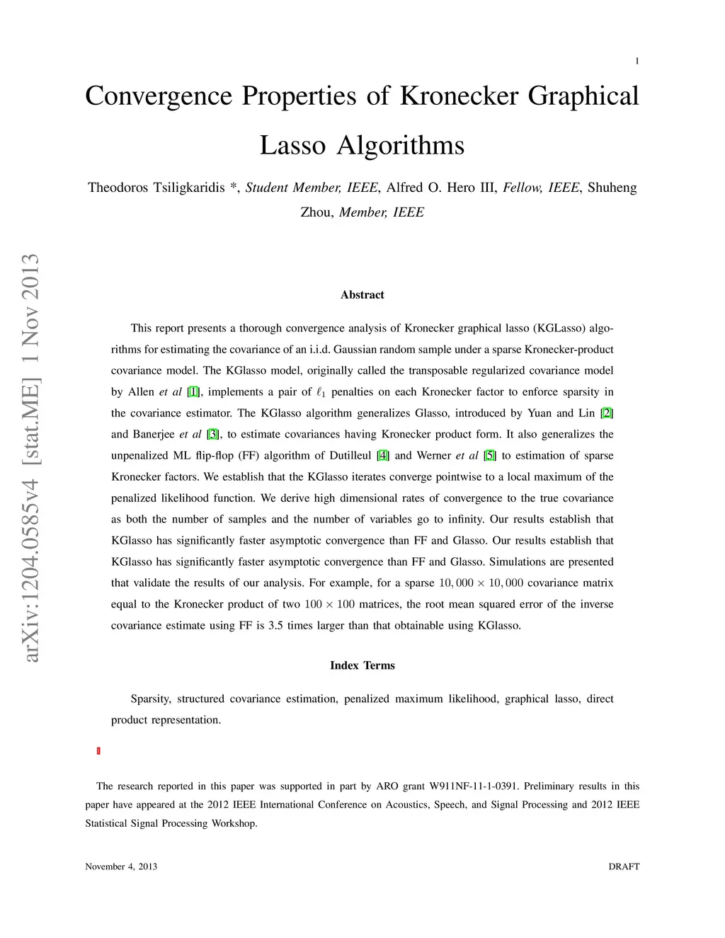 This paper studies iteration convergence of Kronecker graphical lasso (KGLasso) algorithms for estimating the covariance of an i.i.d. Gaussian random sample under a sparse Kronecker-product covariance model and MSE convergence rates. The KGlasso model, originally called the transposable regularized covariance model by Allen ["Transposable regularized covariance models with an application to missing data imputation," Ann. Appl. Statist., vol. 4, no. 2, pp. 764-790, 2010], implements a pair of penalties on each Kronecker factor to enforce sparsity in the covariance estimator. The KGlasso algorithm generalizes Glasso, introduced by Yuan and Lin ["Model selection and estimation in the Gaussian graphical model," Biometrika, vol. 94, pp. 19-35, 2007] and Banerjee ["Model selection through sparse maximum likelihood estimation for multivariate Gaussian or binary data," J. Mach. Learn. Res., vol. 9, pp. 485-516, Mar. 2008], to estimate covariances having Kronecker product form. It also generalizes the unpenalized ML flip-flop (FF) algorithm of Dutilleul ["The MLE algorithm for the matrix normal distribution," J. Statist. Comput. Simul., vol. 64, pp. 105-123, 1999] and Werner ["On estimation of covariance matrices with Kronecker product structure," IEEE Trans. Signal Process., vol. 56, no. 2, pp. 478-491, Feb. 2008] to estimation of sparse Kronecker factors. We establish that the KGlasso iterates converge pointwise to a local maximum of the penalized likelihood function. We derive high dimensional rates of convergence to the true covariance as both the number of samples and the number of variables go to infinity. Our results establish that KGlasso has significantly faster asymptotic convergence than Glasso and FF. Simulations are presented that validate the results of our analysis.