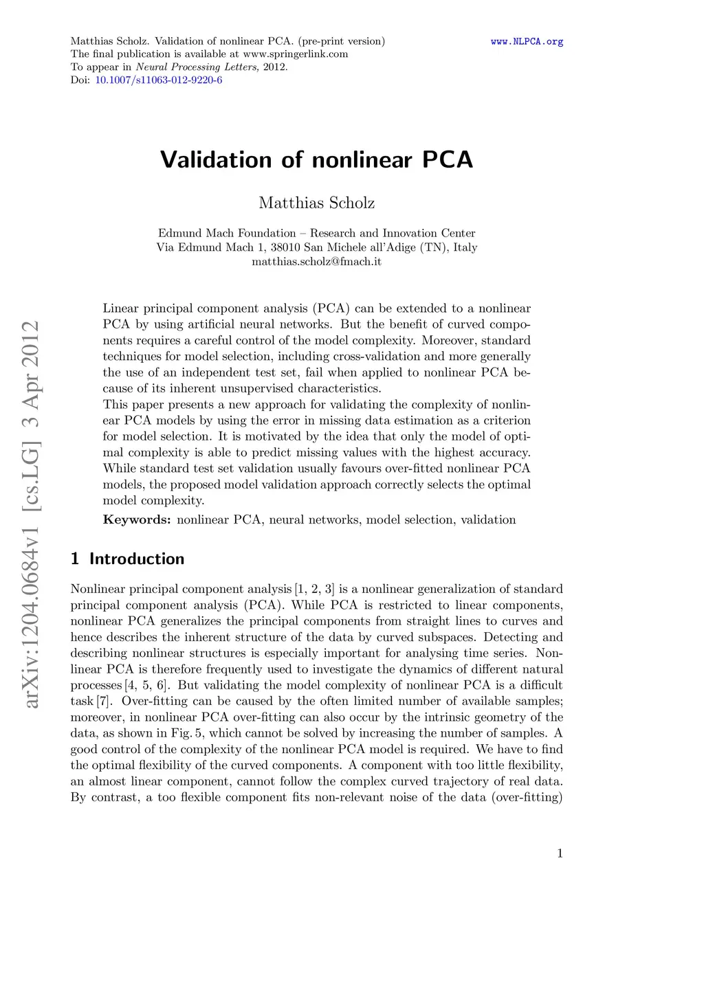 Linear principal component analysis (PCA) can be extended to a nonlinear PCA by using artificial neural networks. But the benefit of curved components requires a careful control of the model complexity. Moreover, standard techniques for model selection, including cross-validation and more generally the use of an independent test set, fail when applied to nonlinear PCA because of its inherent unsupervised characteristics. This paper presents a new approach for validating the complexity of nonlinear PCA models by using the error in missing data estimation as a criterion for model selection. It is motivated by the idea that only the model of optimal complexity is able to predict missing values with the highest accuracy. While standard test set validation usually favours over-fitted nonlinear PCA models, the proposed model validation approach correctly selects the optimal model complexity.
