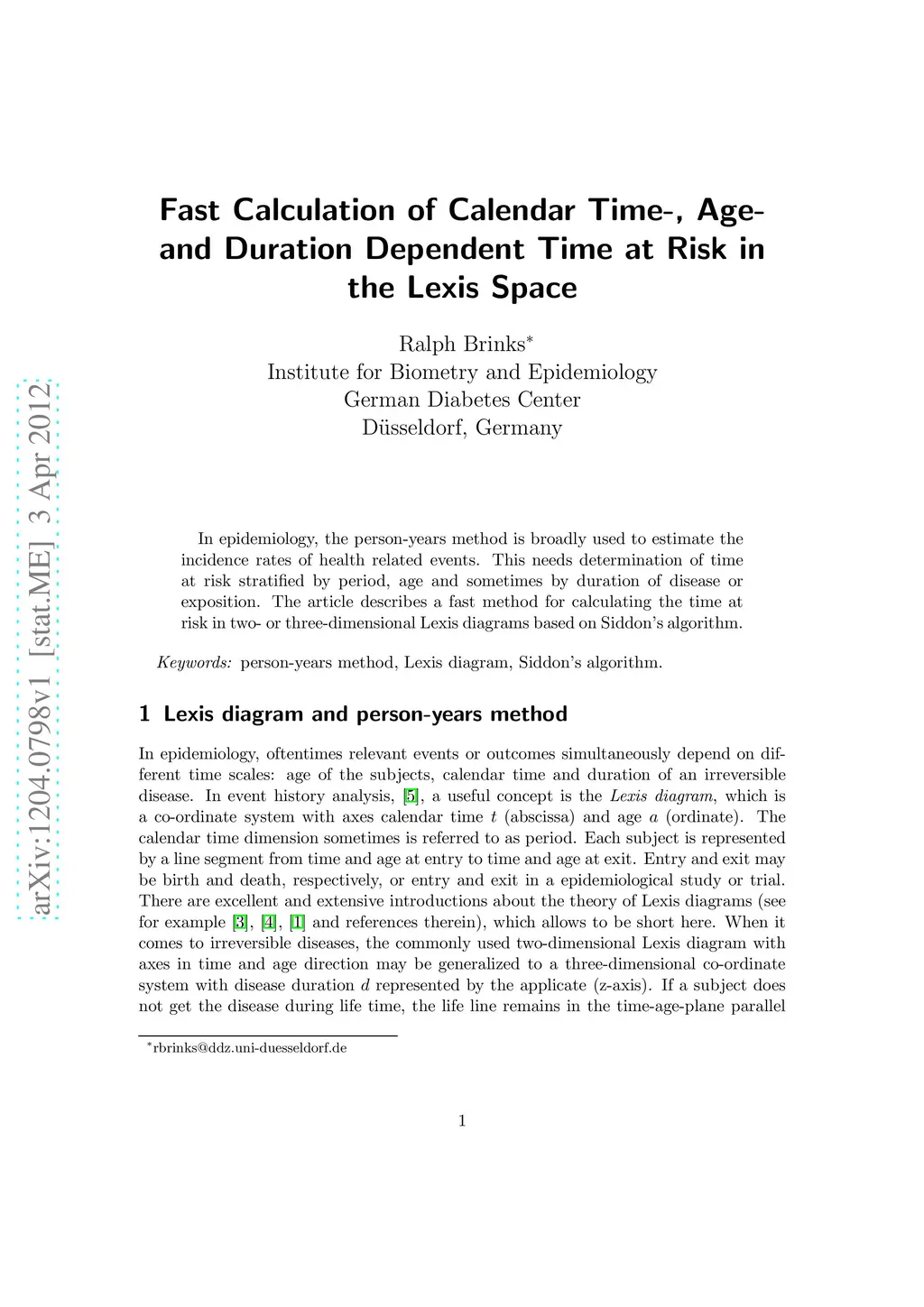 In epidemiology, the person-years method is broadly used to estimate the incidence rates of health related events. This needs determination of time at risk stratified by period, age and sometimes by duration of disease or exposition. The article describes a fast method for calculating the time at risk in two- or three-dimensional Lexis diagrams based on Siddon's algorithm.