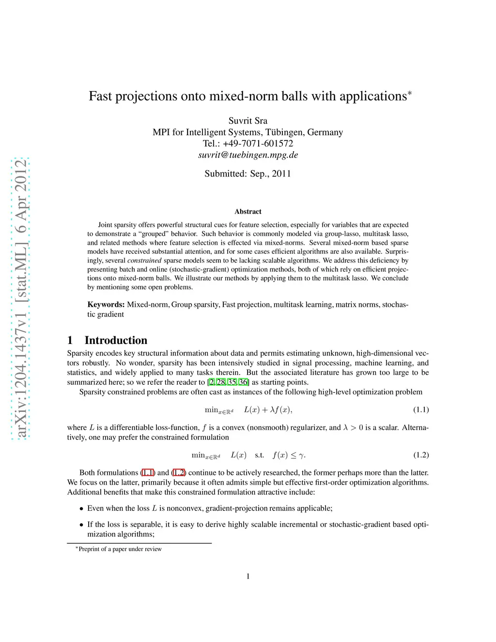 Joint sparsity offers powerful structural cues for feature selection, especially for variables that are expected to demonstrate a "grouped" behavior. Such behavior is commonly modeled via group-lasso, multitask lasso, and related methods where feature selection is effected via mixed-norms. Several mixed-norm based sparse models have received substantial attention, and for some cases efficient algorithms are also available. Surprisingly, several constrained sparse models seem to be lacking scalable algorithms. We address this deficiency by presenting batch and online (stochastic-gradient) optimization methods, both of which rely on efficient projections onto mixed-norm balls. We illustrate our methods by applying them to the multitask lasso. We conclude by mentioning some open problems.