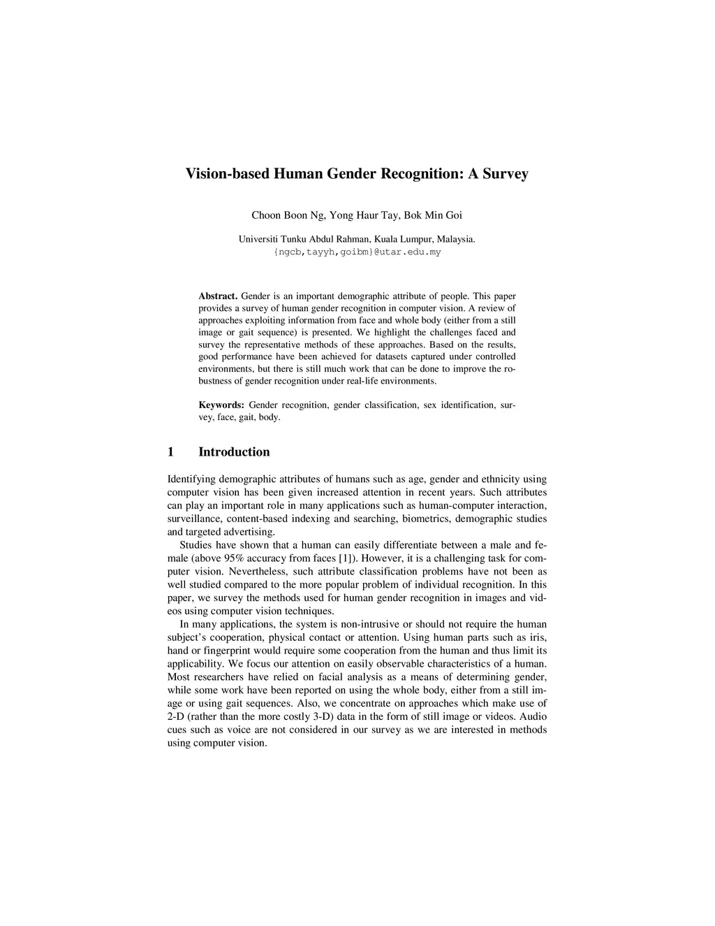Gender is an important demographic attribute of people. This paper provides a survey of human gender recognition in computer vision. A review of approaches exploiting information from face and whole body (either from a still image or gait sequence) is presented. We highlight the challenges faced and survey the representative methods of these approaches. Based on the results, good performance have been achieved for datasets captured under controlled environments, but there is still much work that can be done to improve the robustness of gender recognition under real-life environments.