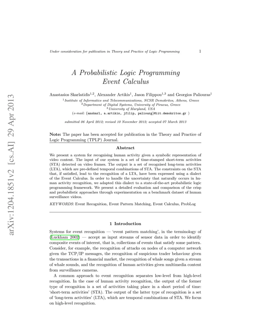 We present a system for recognising human activity given a symbolic representation of video content. The input of our system is a set of time-stamped short-term activities (STA) detected on video frames. The output is a set of recognised long-term activities (LTA), which are pre-defined temporal combinations of STA. The constraints on the STA that, if satisfied, lead to the recognition of a LTA, have been expressed using a dialect of the Event Calculus. In order to handle the uncertainty that naturally occurs in human activity recognition, we adapted this dialect to a state-of-the-art probabilistic logic programming framework. We present a detailed evaluation and comparison of the crisp and probabilistic approaches through experimentation on a benchmark dataset of human surveillance videos.