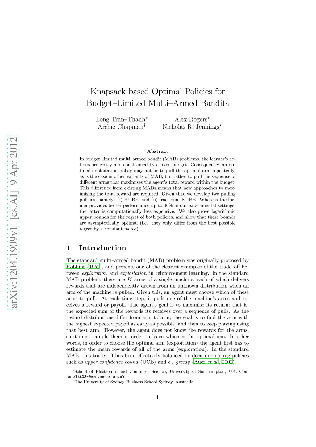 In budget-limited multi-armed bandit (MAB) problems, the learner's actions are costly and constrained by a fixed budget. Consequently, an optimal exploitation policy may not be to pull the optimal arm repeatedly, as is the case in other variants of MAB, but rather to pull the sequence of different arms that maximises the agent's total reward within the budget. This difference from existing MABs means that new approaches to maximising the total reward are required. Given this, we develop two pulling policies, namely: (i) KUBE; and (ii) fractional KUBE. Whereas the former provides better performance up to 40% in our experimental settings, the latter is computationally less expensive. We also prove logarithmic upper bounds for the regret of both policies, and show that these bounds are asymptotically optimal (i.e. they only differ from the best possible regret by a constant factor).