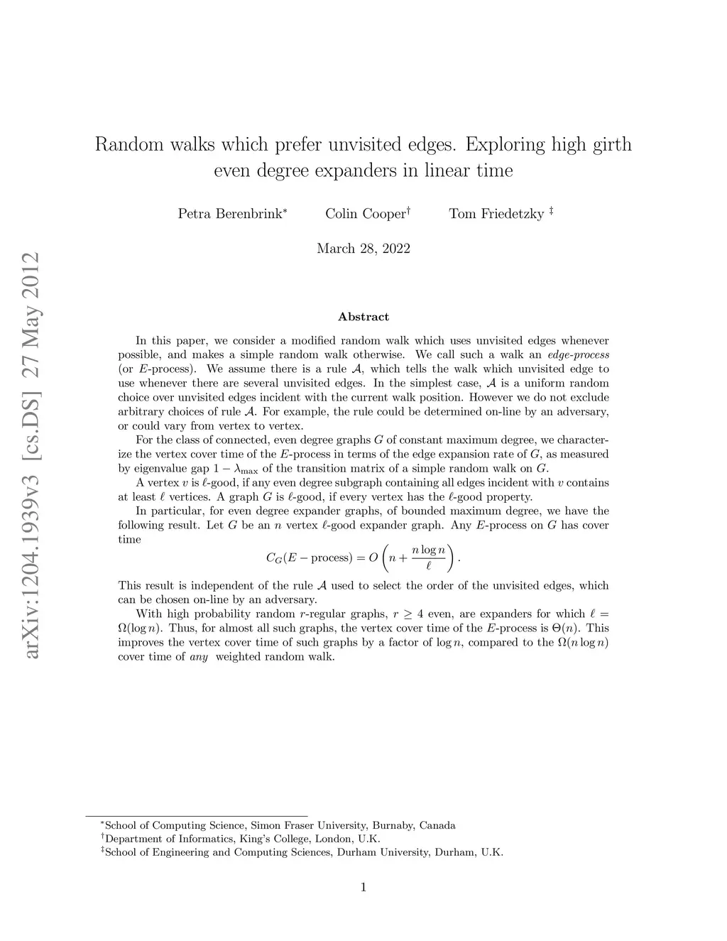 We consider a modified random walk which uses unvisited edges whenever possible, and makes a simple random walk otherwise. We call such a walk an edge-process. We assume there is a rule A, which tells the walk which unvisited edge to use whenever there is a choice. In the simplest case, A is a uniform random choice over unvisited edges incident with the current walk position. However we do not exclude arbitrary choices of rule A. For example, the rule could be determined on-line by an adversary, or could vary from vertex to vertex. For even degree expander graphs, of bounded maximum degree, we have the following result. Let G be an n vertex even degree expander graph, for which every vertex is in at least one vertex induced cycle of length L. Any edge-process on G has cover time (n+ (n log n)/L). This result is independent of the rule A used to select the order of the unvisited edges, which can be chosen on-line by an adversary. As an example, With high probability, random r-regular graphs, (r at least 4, even), are expanders for which L = Omega(log n). Thus, for almost all such graphs, the vertex cover time of the edge-process is Theta(n). This improves the vertex cover time of such graphs by a factor of log n, compared to the Omega(n log n) cover time of any weighted random walk.