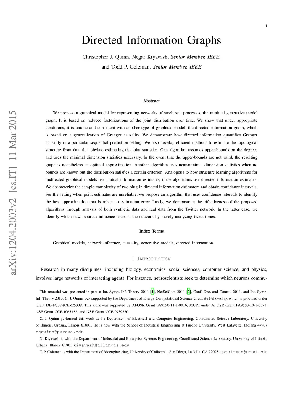 We propose a graphical model for representing networks of stochastic processes, the minimal generative model graph. It is based on reduced factorizations of the joint distribution over time. We show that under appropriate conditions, it is unique and consistent with another type of graphical model, the directed information graph, which is based on a generalization of Granger causality. We demonstrate how directed information quantifies Granger causality in a particular sequential prediction setting. We also develop efficient methods to estimate the topological structure from data that obviate estimating the joint statistics. One algorithm assumes upper-bounds on the degrees and uses the minimal dimension statistics necessary. In the event that the upper-bounds are not valid, the resulting graph is nonetheless an optimal approximation. Another algorithm uses near-minimal dimension statistics when no bounds are known but the distribution satisfies a certain criterion. Analogous to how structure learning algorithms for undirected graphical models use mutual information estimates, these algorithms use directed information estimates. We characterize the sample-complexity of two plug-in directed information estimators and obtain confidence intervals. For the setting when point estimates are unreliable, we propose an algorithm that uses confidence intervals to identify the best approximation that is robust to estimation error. Lastly, we demonstrate the effectiveness of the proposed algorithms through analysis of both synthetic data and real data from the Twitter network. In the latter case, we identify which news sources influence users in the network by merely analyzing tweet times.