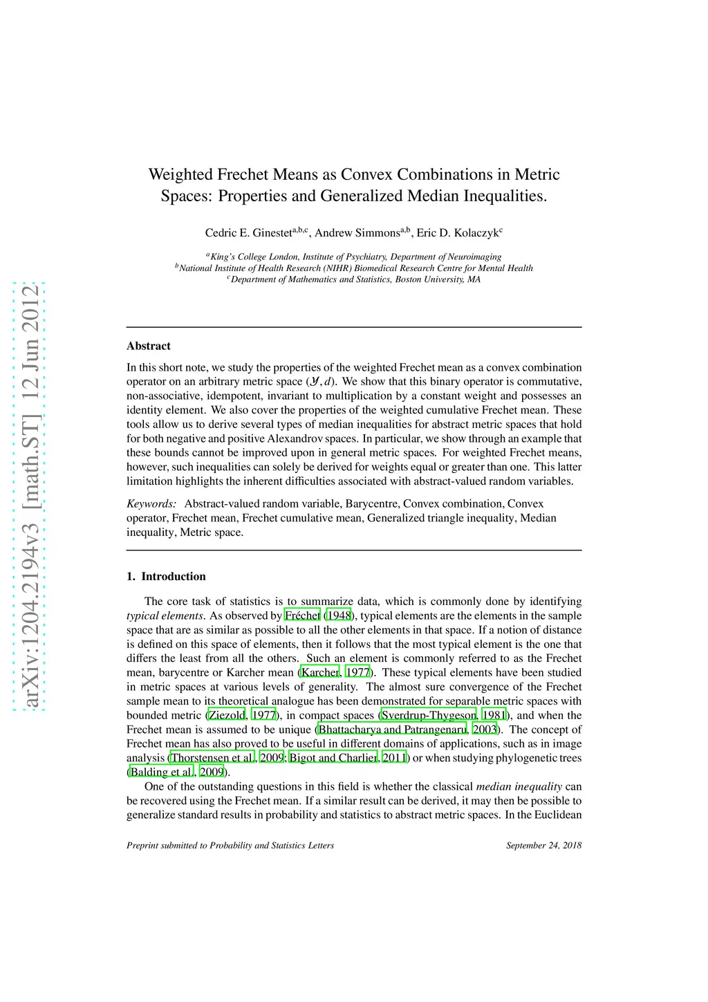In this short note, we study the properties of the weighted Frechet mean as a convex combination operator on an arbitrary metric space, (Y,d). We show that this binary operator is commutative, non-associative, idempotent, invariant to multiplication by a constant weight and possesses an identity element. We also treat the properties of the weighted cumulative Frechet mean. These tools allow us to derive several types of median inequalities for abstract metric spaces that hold for both negative and positive Alexandrov spaces. In particular, we show through an example that these bounds cannot be improved upon in general metric spaces. For weighted Frechet means, however, such inequalities can solely be derived for weights equal or greater than one. This latter limitation highlights the inherent difficulties associated with working with abstract-valued random variables.