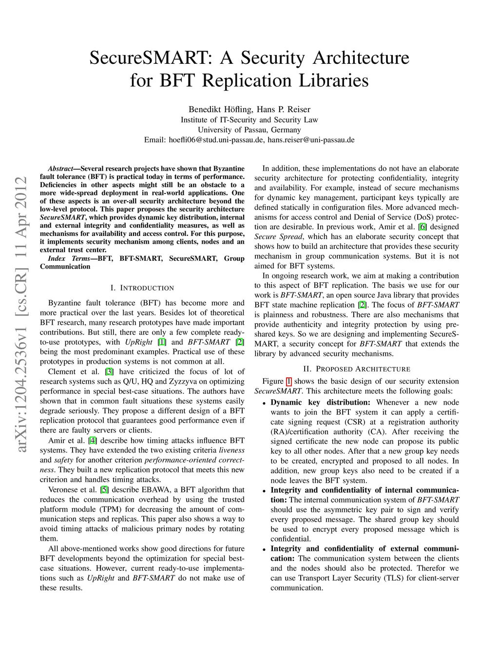 SecureSMART: A Security Architecture for BFT Replication Libraries