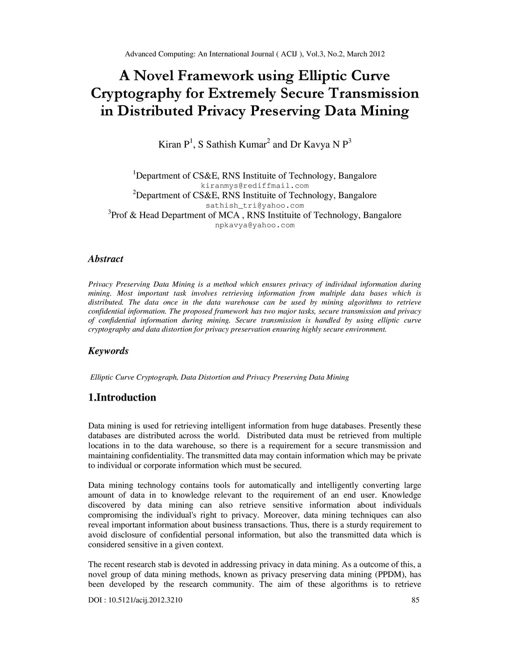 Privacy Preserving Data Mining is a method which ensures privacy of individual information during mining. Most important task involves retrieving information from multiple data bases which is distributed. The data once in the data warehouse can be used by mining algorithms to retrieve confidential information. The proposed framework has two major tasks, secure transmission and privacy of confidential information during mining. Secure transmission is handled by using elliptic curve cryptography and data distortion for privacy preservation ensuring highly secure environment.