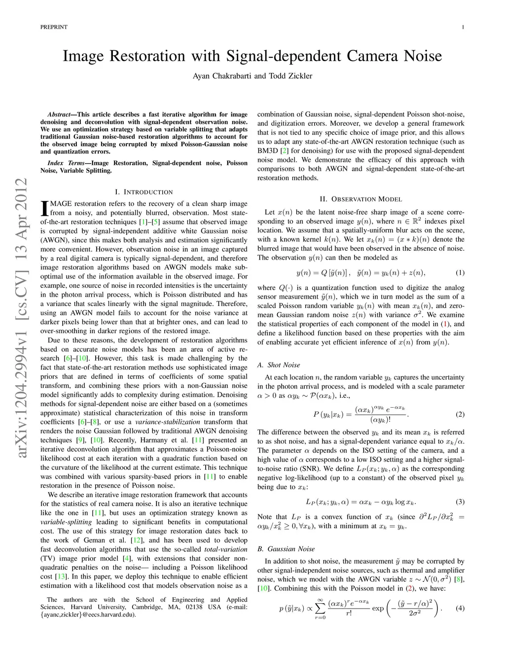 This article describes a fast iterative algorithm for image denoising and deconvolution with signal-dependent observation noise. We use an optimization strategy based on variable splitting that adapts traditional Gaussian noise-based restoration algorithms to account for the observed image being corrupted by mixed Poisson-Gaussian noise and quantization errors.