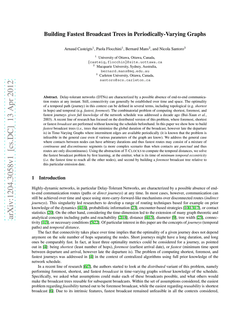 Delay-tolerant networks (DTNs) are characterized by a possible absence of end-to-end communication routes at any instant. Still, connectivity can generally be established over time and space. The optimality of a temporal path (journey) in this context can be defined in several terms, including topological (e.g. {\em shortest} in hops) and temporal (e.g. {\em fastest, foremost}). The combinatorial problem of computing shortest, foremost, and fastest journeys {\em given full knowledge} of the network schedule was addressed a decade ago (Bui-Xuan {\it et al.}, 2003). A recent line of research has focused on the distributed version of this problem, where foremost, shortest or fastest {\em broadcast} are performed without knowing the schedule beforehand. In this paper we show how to build {\em fastest} broadcast trees (i.e., trees that minimize the global duration of the broadcast, however late the departure is) in Time-Varying Graphs where intermittent edges are available periodically (it is known that the problem is infeasible in the general case even if various parameters of the graph are know). We address the general case where contacts between nodes can have arbitrary durations and thus fastest routes may consist of a mixture of {\em continuous} and {\em discontinuous} segments (a more complex scenario than when contacts are {\em punctual} and thus routes are only discontinuous). Using the abstraction of \tclocks to compute the temporal distances, we solve the fastest broadcast problem by first learning, at the emitter, what is its time of {\em minimum temporal eccentricity} (i.e. the fastest time to reach all the other nodes), and second by building a {\em foremost} broadcast tree relative to this particular emission date.