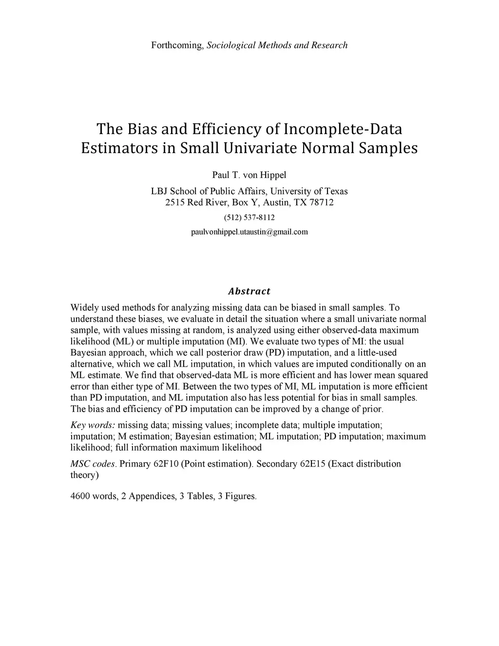 Widely used methods for analyzing missing data can be biased in small samples. To understand these biases, we evaluate in detail the situation where a small univariate normal sample, with values missing at random, is analyzed using either observed-data maximum likelihood (ML) or multiple imputation (MI). We evaluate two types of MI: the usual Bayesian approach, which we call posterior draw (PD) imputation, and a little-used alternative, which we call ML imputation, in which values are imputed conditionally on an ML estimate. We find that observed-data ML is more efficient and has lower mean squared error than either type of MI. Between the two types of MI, ML imputation is more efficient than PD imputation, and ML imputation also has less potential for bias in small samples. The bias and efficiency of PD imputation can be improved by a change of prior.