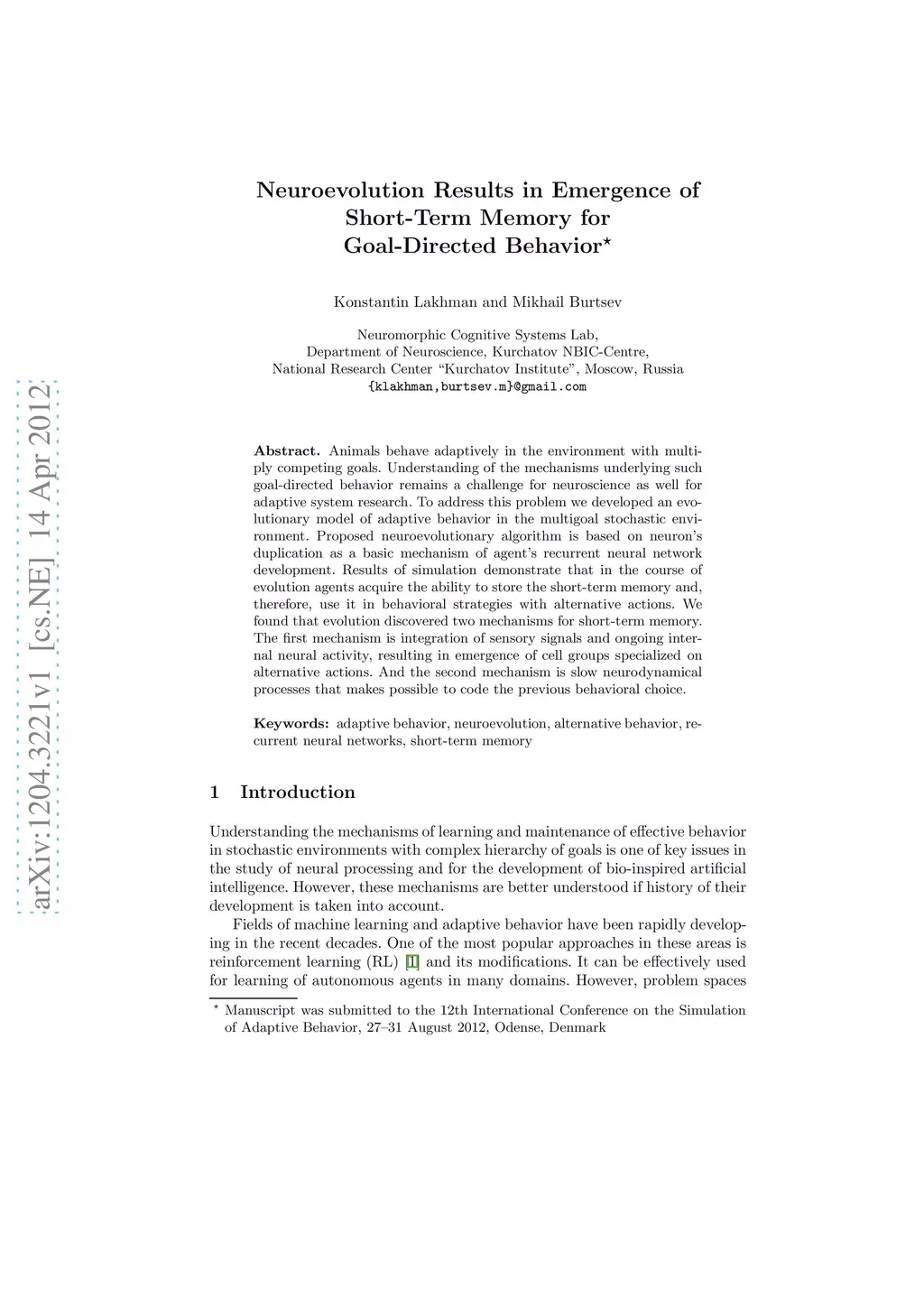 Animals behave adaptively in the environment with multiply competing goals. Understanding of the mechanisms underlying such goal-directed behavior remains a challenge for neuroscience as well for adaptive system research. To address this problem we developed an evolutionary model of adaptive behavior in the multigoal stochastic environment. Proposed neuroevolutionary algorithm is based on neuron's duplication as a basic mechanism of agent's recurrent neural network development. Results of simulation demonstrate that in the course of evolution agents acquire the ability to store the short-term memory and, therefore, use it in behavioral strategies with alternative actions. We found that evolution discovered two mechanisms for short-term memory. The first mechanism is integration of sensory signals and ongoing internal neural activity, resulting in emergence of cell groups specialized on alternative actions. And the second mechanism is slow neurodynamical processes that makes possible to code the previous behavioral choice.