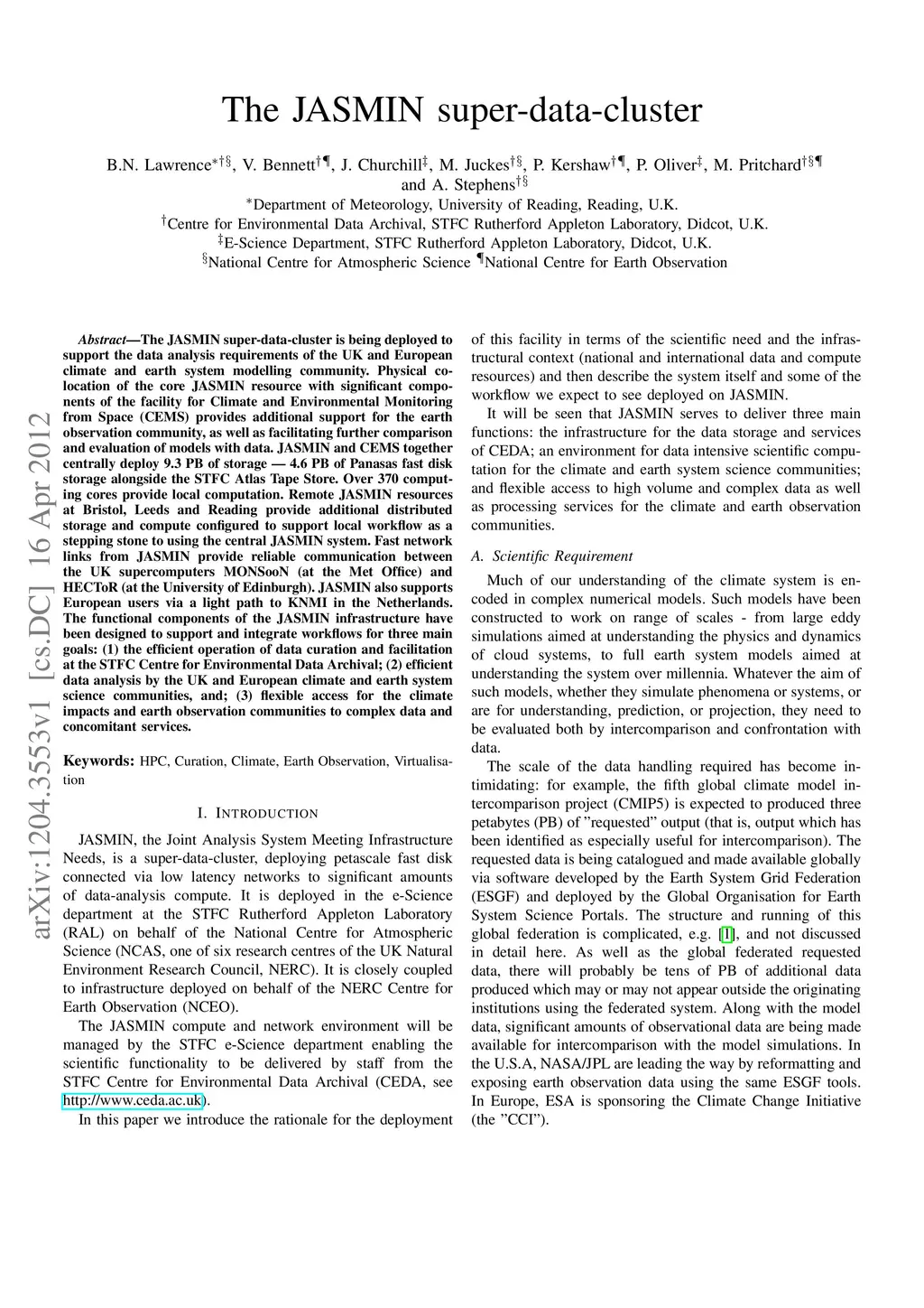 The JASMIN super-data-cluster is being deployed to support the data analysis requirements of the UK and European climate and earth system modelling community. Physical colocation of the core JASMIN resource with significant components of the facility for Climate and Environmental Monitoring from Space (CEMS) provides additional support for the earth observation community, as well as facilitating further comparison and evaluation of models with data. JASMIN and CEMS together centrally deploy 9.3 PB of storage - 4.6 PB of Panasas fast disk storage alongside the STFC Atlas Tape Store. Over 370 computing cores provide local computation. Remote JASMIN resources at Bristol, Leeds and Reading provide additional distributed storage and compute configured to support local workflow as a stepping stone to using the central JASMIN system. Fast network links from JASMIN provide reliable communication between the UK supercomputers MONSooN (at the Met Office) and HECToR (at the University of Edinburgh). JASMIN also supports European users via a light path to KNMI in the Netherlands. The functional components of the JASMIN infrastructure have been designed to support and integrate workflows for three main goals: (1) the efficient operation of data curation and facilitation at the STFC Centre for Environmental Data Archival; (2) efficient data analysis by the UK and European climate and earth system science communities, and; (3) flexible access for the climate impacts and earth observation communities to complex data and concomitant services.