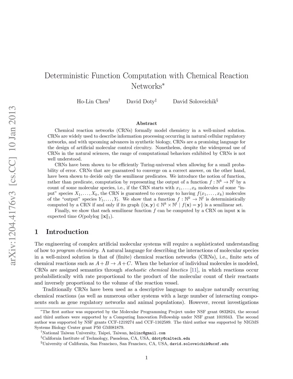 Chemical reaction networks (CRNs) formally model chemistry in a well-mixed solution. CRNs are widely used to describe information processing occurring in natural cellular regulatory networks, and with upcoming advances in synthetic biology, CRNs are a promising language for the design of artificial molecular control circuitry. Nonetheless, despite the widespread use of CRNs in the natural sciences, the range of computational behaviors exhibited by CRNs is not well understood. CRNs have been shown to be efficiently Turing-universal when allowing for a small probability of error. CRNs that are guaranteed to converge on a correct answer, on the other hand, have been shown to decide only the semilinear predicates. We introduce the notion of function, rather than predicate, computation by representing the output of a function f:N^k --> N^l by a count of some molecular species, i.e., if the CRN starts with n_1,...,n_k molecules of some "input" species X1,...,Xk, the CRN is guaranteed to converge to having f(n_1,...,n_k) molecules of the "output" species Y1,...,Yl. We show that a function f:N^k --> N^l is deterministically computed by a CRN if and only if its graph {(x,y) | f(x) = y} is a semilinear set. Furthermore, each semilinear function f can be computed on input x in expected time O(polylog(|x|)).