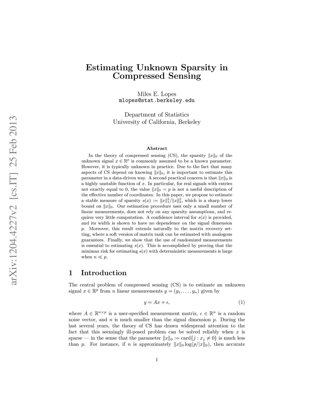 In the theory of compressed sensing (CS), the sparsity ||x||_0 of the unknown signal x\in\R^p is commonly assumed to be a known parameter. However, it is typically unknown in practice. Due to the fact that many aspects of CS depend on knowing ||x||_0, it is important to estimate this parameter in a data-driven way. A second practical concern is that ||x||_0 is a highly unstable function of x. In particular, for real signals with entries not exactly equal to 0, the value ||x||_0=p is not a useful description of the effective number of coordinates. In this paper, we propose to estimate a stable measure of sparsity s(x):=||x||_1^2/||x||_2^2, which is a sharp lower bound on ||x||_0. Our estimation procedure uses only a small number of linear measurements, does not rely on any sparsity assumptions, and requires very little computation. A confidence interval for s(x) is provided, and its width is shown to have no dependence on the signal dimension p. Moreover, this result extends naturally to the matrix recovery setting, where a soft version of matrix rank can be estimated with analogous guarantees. Finally, we show that the use of randomized measurements is essential to estimating s(x). This is accomplished by proving that the minimax risk for estimating s(x) with deterministic measurements is large when n<<p.