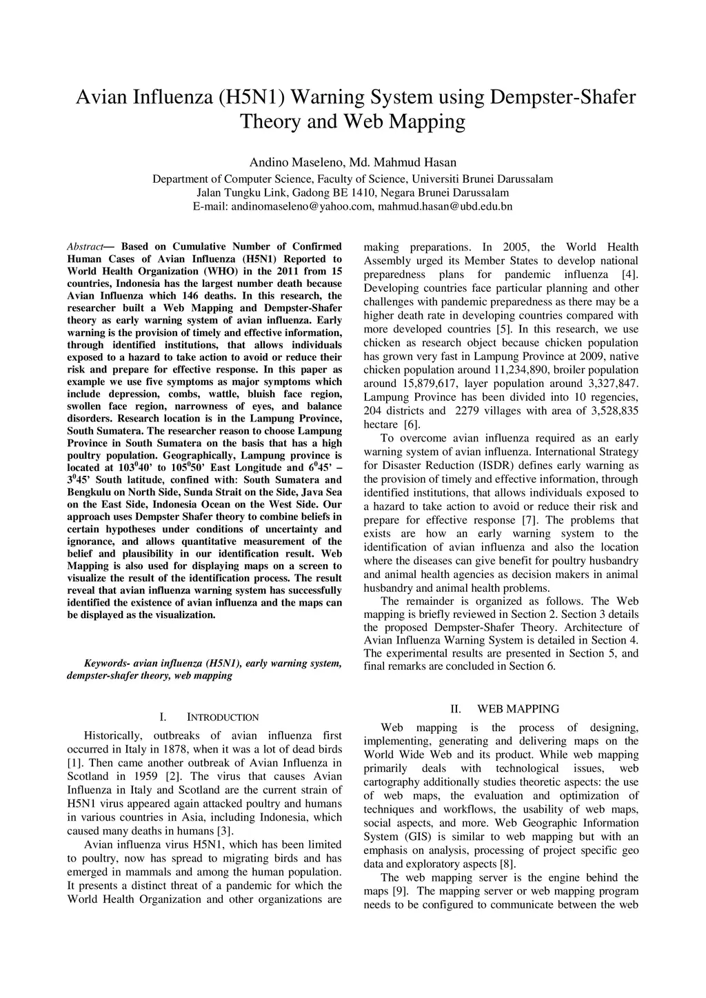 Based on Cumulative Number of Confirmed Human Cases of Avian Influenza (H5N1) Reported to World Health Organization (WHO) in the 2011 from 15 countries, Indonesia has the largest number death because Avian Influenza which 146 deaths. In this research, the researcher built a Web Mapping and Dempster-Shafer theory as early warning system of avian influenza. Early warning is the provision of timely and effective information, through identified institutions, that allows individuals exposed to a hazard to take action to avoid or reduce their risk and prepare for effective response. In this paper as example we use five symptoms as major symptoms which include depression, combs, wattle, bluish face region, swollen face region, narrowness of eyes, and balance disorders. Research location is in the Lampung Province, South Sumatera. The researcher reason to choose Lampung Province in South Sumatera on the basis that has a high poultry population. Geographically, Lampung province is located at 103040' to 105050' East Longitude and 6045' - 3045' South latitude, confined with: South Sumatera and Bengkulu on North Side, Sunda Strait on the Side, Java Sea on the East Side, Indonesia Ocean on the West Side. Our approach uses Dempster Shafer theory to combine beliefs in certain hypotheses under conditions of uncertainty and ignorance, and allows quantitative measurement of the belief and plausibility in our identification result. Web Mapping is also used for displaying maps on a screen to visualize the result of the identification process. The result reveal that avian influenza warning system has successfully identified the existence of avian influenza and the maps can be displayed as the visualization.