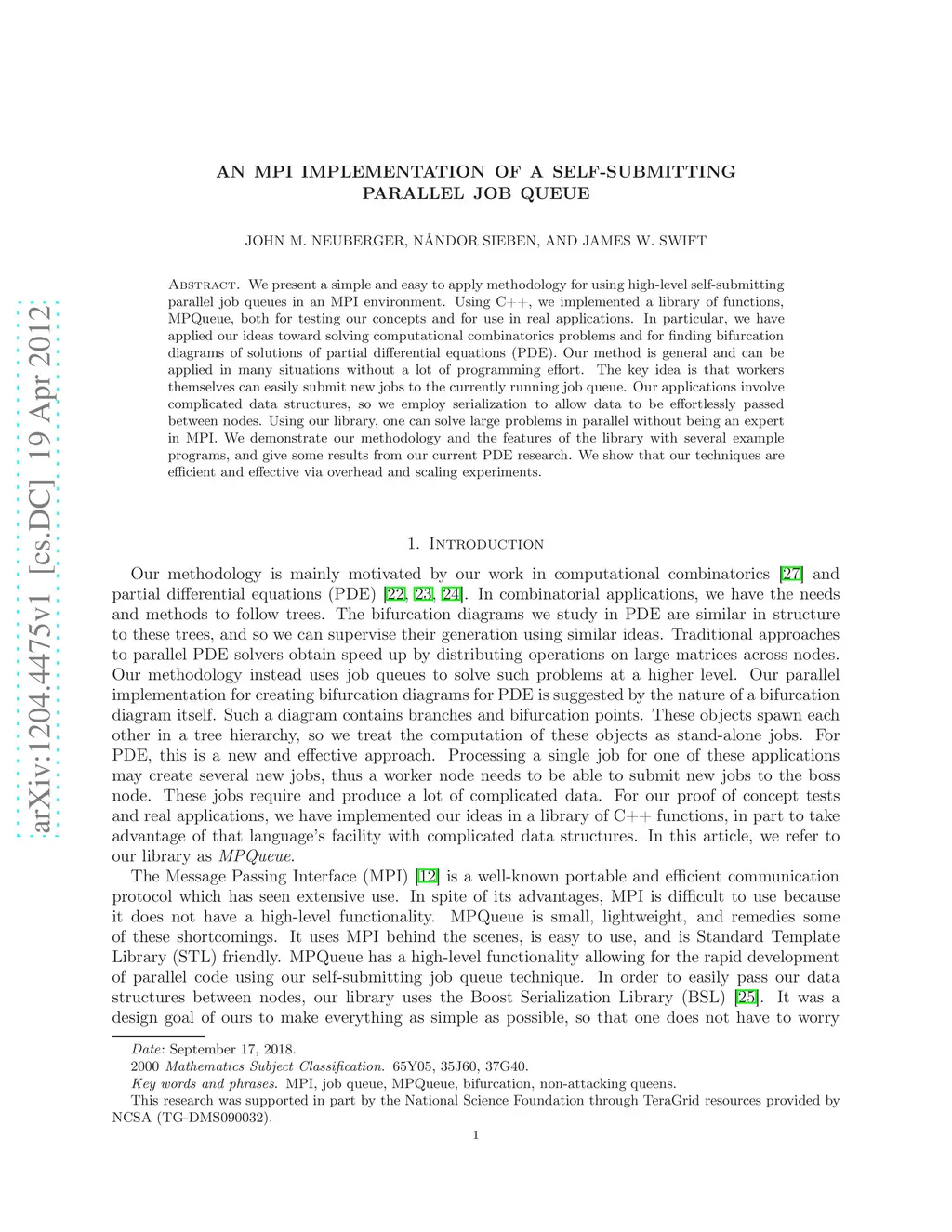 We present a simple and easy to apply methodology for using high-level self-submitting parallel job queues in an MPI environment. Using C++, we implemented a library of functions, MPQueue, both for testing our concepts and for use in real applications. In particular, we have applied our ideas toward solving computational combinatorics problems and for finding bifurcation diagrams of solutions of partial differential equations (PDE). Our method is general and can be applied in many situations without a lot of programming effort. The key idea is that workers themselves can easily submit new jobs to the currently running job queue. Our applications involve complicated data structures, so we employ serialization to allow data to be effortlessly passed between nodes. Using our library, one can solve large problems in parallel without being an expert in MPI. We demonstrate our methodology and the features of the library with several example programs, and give some results from our current PDE research. We show that our techniques are efficient and effective via overhead and scaling experiments.