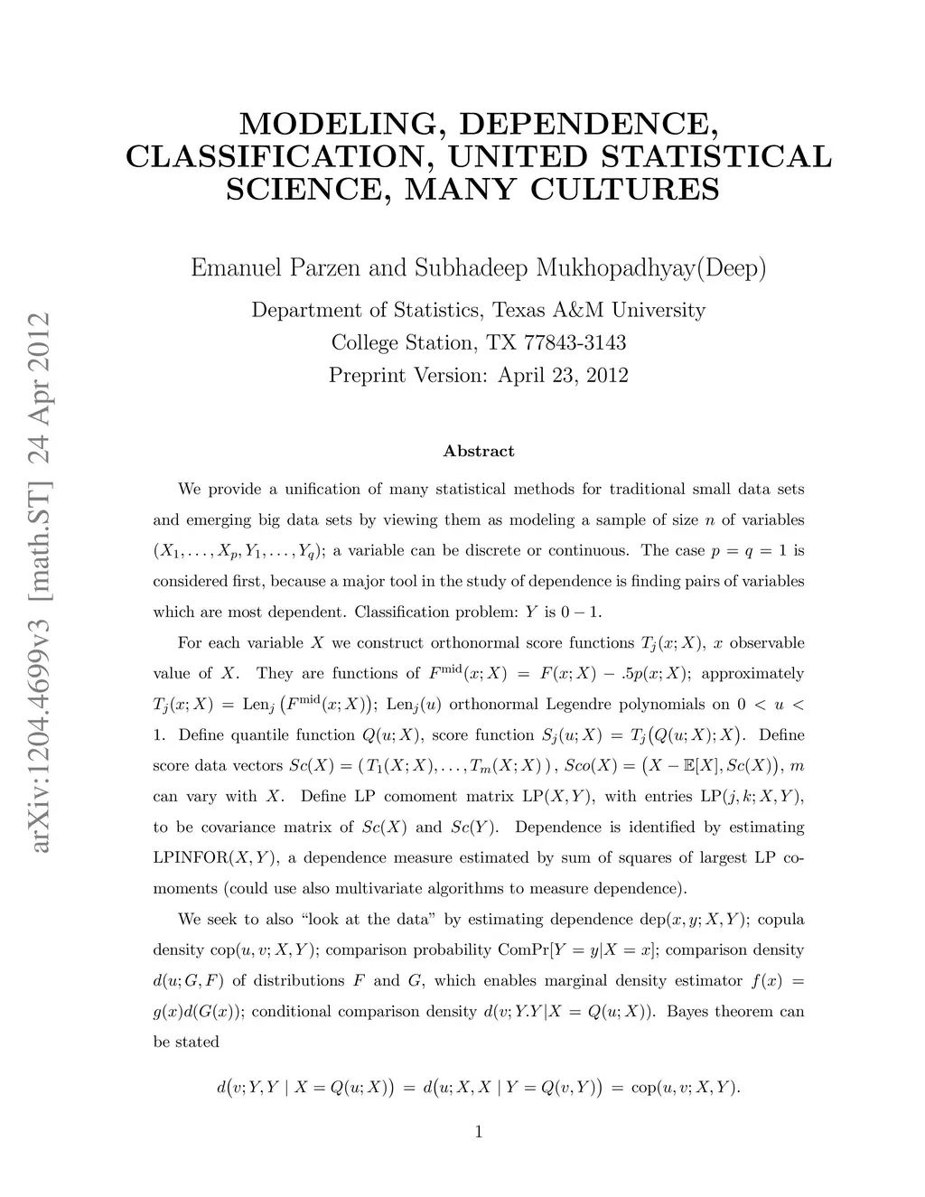 Breiman (2001) proposed to statisticians awareness of two cultures: 1. Parametric modeling culture, pioneered by R.A.Fisher and Jerzy Neyman; 2. Algorithmic predictive culture, pioneered by machine learning research. Parzen (2001), as a part of discussing Breiman (2001), proposed that researchers be aware of many cultures, including the focus of our research: 3. Nonparametric, quantile based, information theoretic modeling. We provide a unification of many statistical methods for traditional small data sets and emerging big data sets in terms of comparison density, copula density, measure of dependence, correlation, information, new measures (called LP score comoments) that apply to long tailed distributions with out finite second order moments. A very important goal is to unify methods for discrete and continuous random variables. Our research extends these methods to modern high dimensional data modeling.