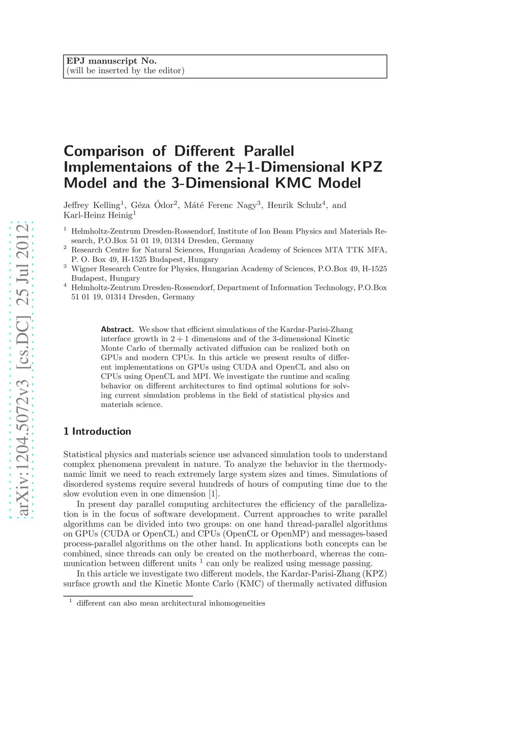 We show that efficient simulations of the Kardar-Parisi-Zhang interface growth in 2 + 1 dimensions and of the 3-dimensional Kinetic Monte Carlo of thermally activated diffusion can be realized both on GPUs and modern CPUs. In this article we present results of different implementations on GPUs using CUDA and OpenCL and also on CPUs using OpenCL and MPI. We investigate the runtime and scaling behavior on different architectures to find optimal solutions for solving current simulation problems in the field of statistical physics and materials science.