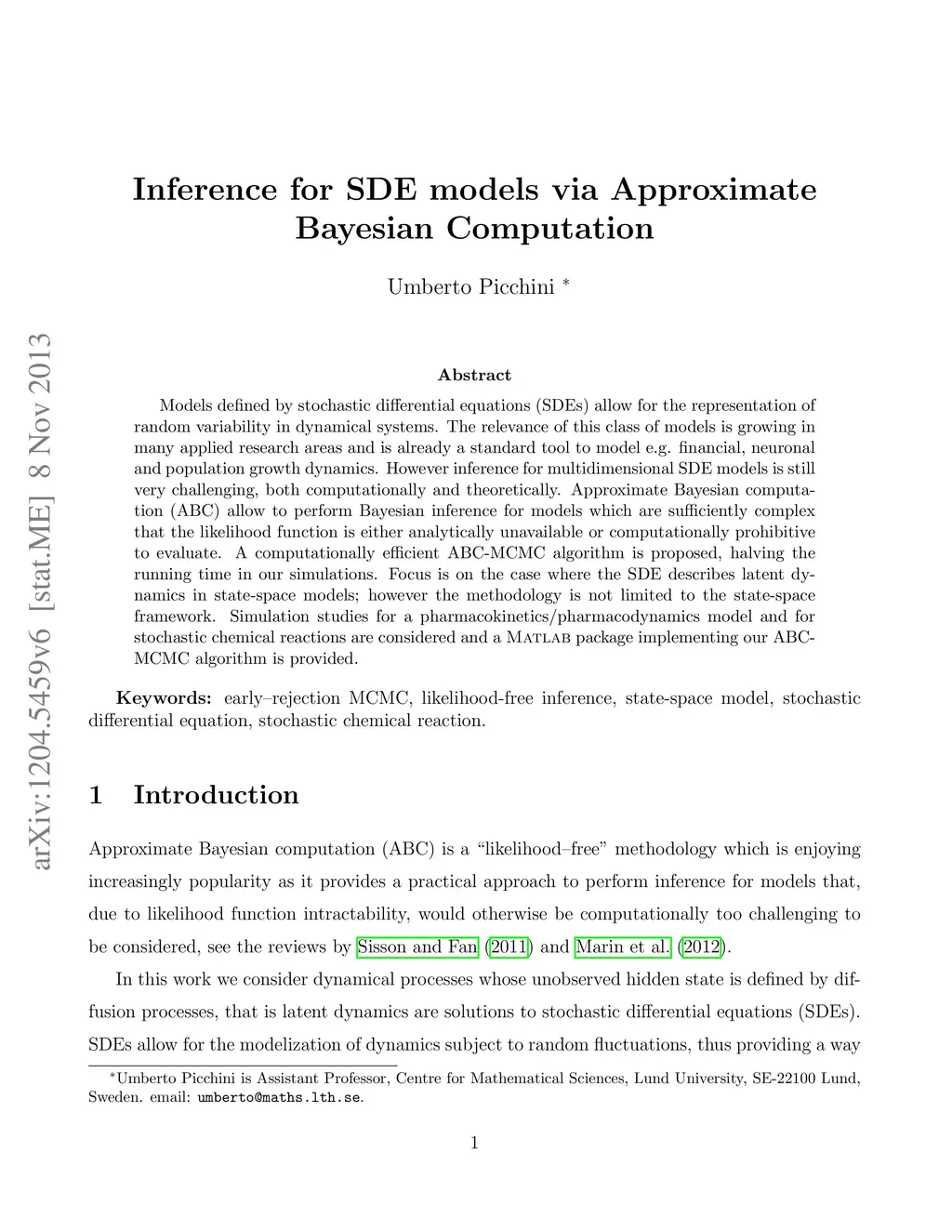 Models defined by stochastic differential equations (SDEs) allow for the representation of random variability in dynamical systems. The relevance of this class of models is growing in many applied research areas and is already a standard tool to model e.g. financial, neuronal and population growth dynamics. However inference for multidimensional SDE models is still very challenging, both computationally and theoretically. Approximate Bayesian computation (ABC) allow to perform Bayesian inference for models which are sufficiently complex that the likelihood function is either analytically unavailable or computationally prohibitive to evaluate. A computationally efficient ABC-MCMC algorithm is proposed, halving the running time in our simulations. Focus is on the case where the SDE describes latent dynamics in state-space models; however the methodology is not limited to the state-space framework. Simulation studies for a pharmacokinetics/pharmacodynamics model and for stochastic chemical reactions are considered and a MATLAB package implementing our ABC-MCMC algorithm is provided.