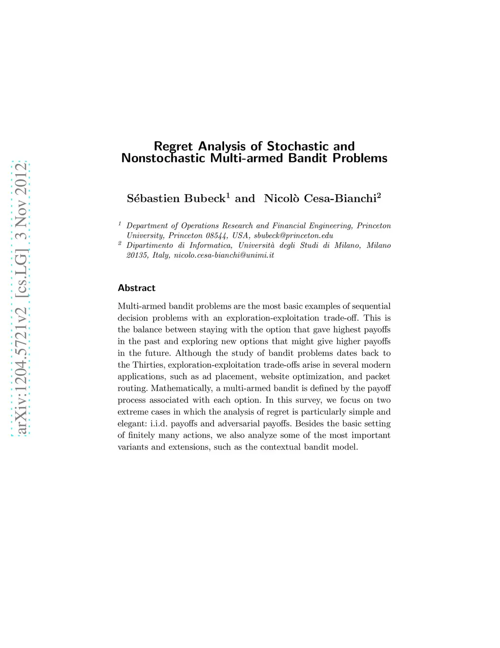 Multi-armed bandit problems are the most basic examples of sequential decision problems with an exploration-exploitation trade-off. This is the balance between staying with the option that gave highest payoffs in the past and exploring new options that might give higher payoffs in the future. Although the study of bandit problems dates back to the Thirties, exploration-exploitation trade-offs arise in several modern applications, such as ad placement, website optimization, and packet routing. Mathematically, a multi-armed bandit is defined by the payoff process associated with each option. In this survey, we focus on two extreme cases in which the analysis of regret is particularly simple and elegant: i.i.d. payoffs and adversarial payoffs. Besides the basic setting of finitely many actions, we also analyze some of the most important variants and extensions, such as the contextual bandit model.