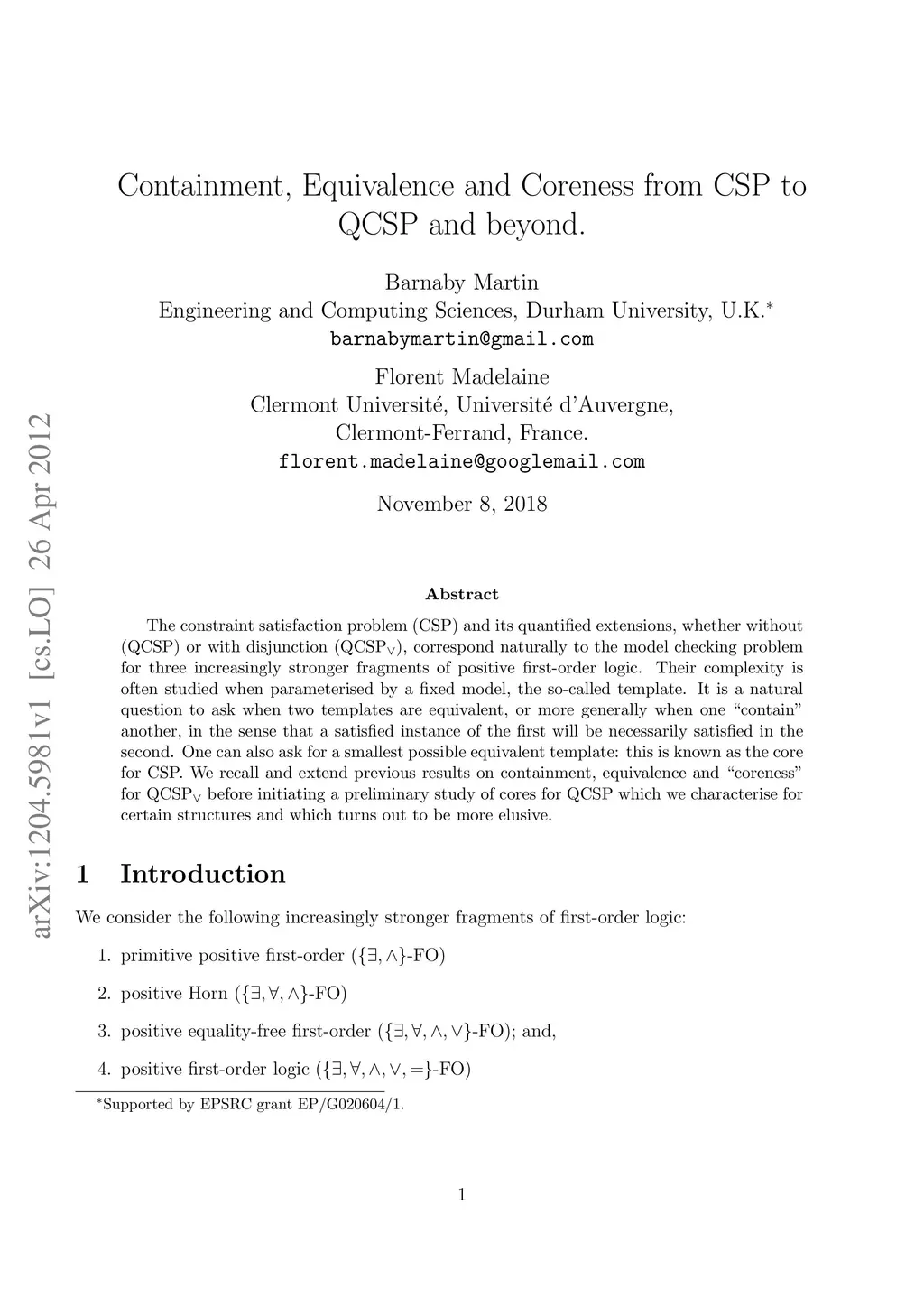 The constraint satisfaction problem (CSP) and its quantified extensions, whether without (QCSP) or with disjunction (QCSP_or), correspond naturally to the model checking problem for three increasingly stronger fragments of positive first-order logic. Their complexity is often studied when parameterised by a fixed model, the so-called template. It is a natural question to ask when two templates are equivalent, or more generally when one "contain" another, in the sense that a satisfied instance of the first will be necessarily satisfied in the second. One can also ask for a smallest possible equivalent template: this is known as the core for CSP. We recall and extend previous results on containment, equivalence and "coreness" for QCSP_or before initiating a preliminary study of cores for QCSP which we characterise for certain structures and which turns out to be more elusive.
