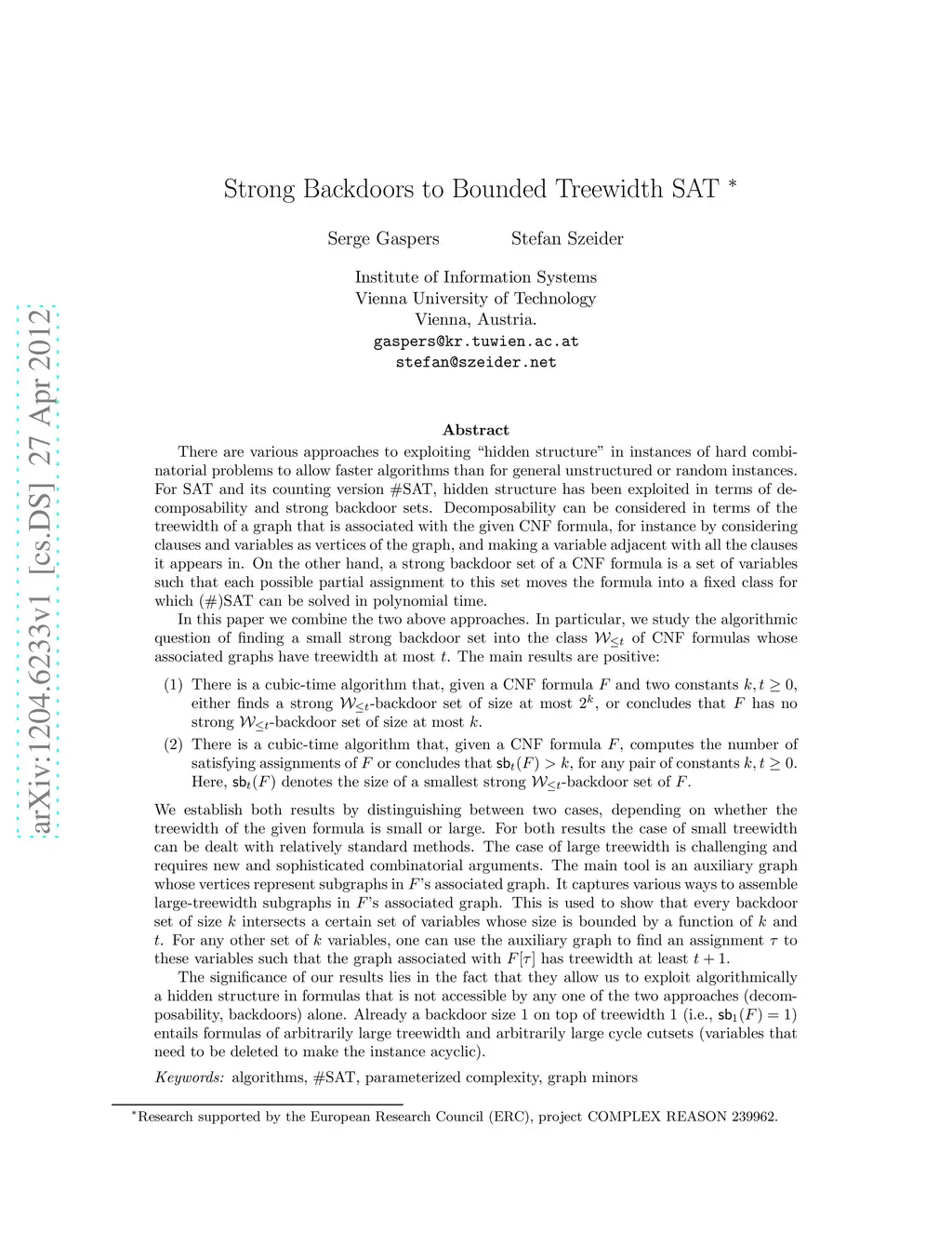 There are various approaches to exploiting "hidden structure" in instances of hard combinatorial problems to allow faster algorithms than for general unstructured or random instances. For SAT and its counting version #SAT, hidden structure has been exploited in terms of decomposability and strong backdoor sets. Decomposability can be considered in terms of the treewidth of a graph that is associated with the given CNF formula, for instance by considering clauses and variables as vertices of the graph, and making a variable adjacent with all the clauses it appears in. On the other hand, a strong backdoor set of a CNF formula is a set of variables such that each possible partial assignment to this set moves the formula into a fixed class for which (#)SAT can be solved in polynomial time. In this paper we combine the two above approaches. In particular, we study the algorithmic question of finding a small strong backdoor set into the class W_t of CNF formulas whose associated graphs have treewidth at most t. The main results are positive: (1) There is a cubic-time algorithm that, given a CNF formula F and two constants k,t\ge 0, either finds a strong W_t-backdoor set of size at most 2^k, or concludes that F has no strong W_t-backdoor set of size at most k. (2) There is a cubic-time algorithm that, given a CNF formula F, computes the number of satisfying assignments of F or concludes that sb_t(F)>k, for any pair of constants k,t\ge 0. Here, sb_t(F) denotes the size of a smallest strong W_t-backdoor set of F. The significance of our results lies in the fact that they allow us to exploit algorithmically a hidden structure in formulas that is not accessible by any one of the two approaches (decomposability, backdoors) alone. Already a backdoor size 1 on top of treewidth 1 (i.e., sb_1(F)=1) entails formulas of arbitrarily large treewidth and arbitrarily large cycle cutsets.
