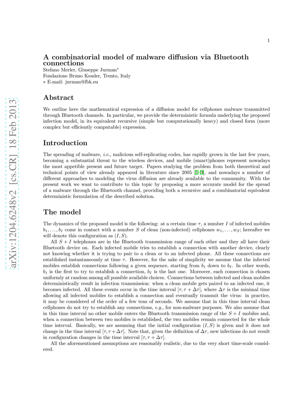 A combinatorial model of malware diffusion via Bluetooth connections
