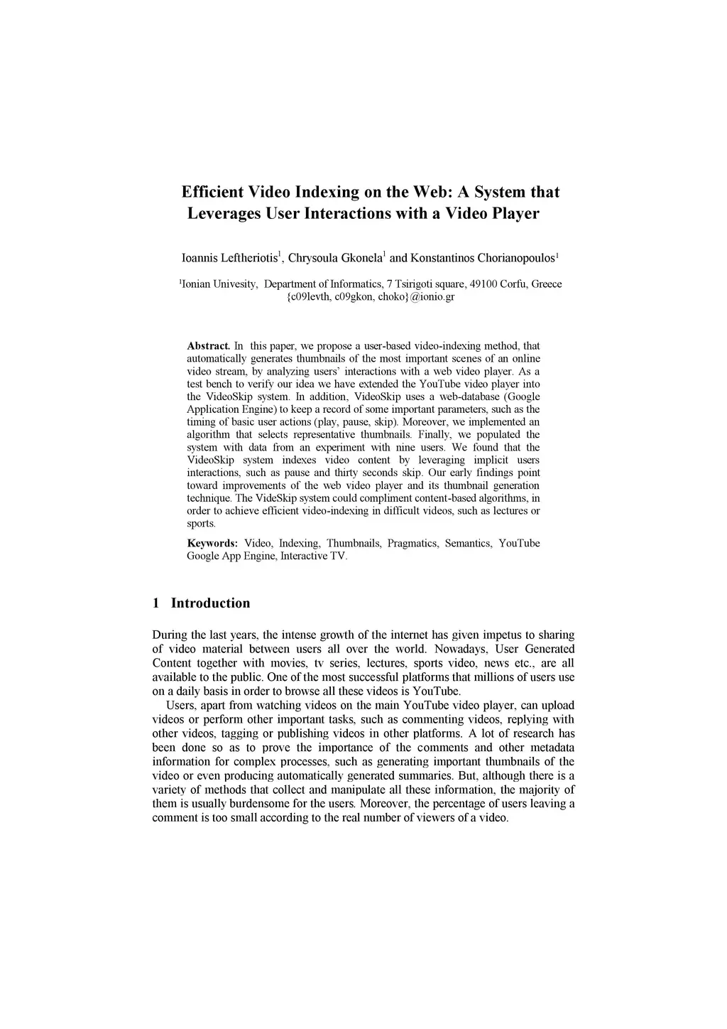 In this paper, we propose a user-based video indexing method, that automatically generates thumbnails of the most important scenes of an online video stream, by analyzing users' interactions with a web video player. As a test bench to verify our idea we have extended the YouTube video player into the VideoSkip system. In addition, VideoSkip uses a web-database (Google Application Engine) to keep a record of some important parameters, such as the timing of basic user actions (play, pause, skip). Moreover, we implemented an algorithm that selects representative thumbnails. Finally, we populated the system with data from an experiment with nine users. We found that the VideoSkip system indexes video content by leveraging implicit users interactions, such as pause and thirty seconds skip. Our early findings point toward improvements of the web video player and its thumbnail generation technique. The VideSkip system could compliment content-based algorithms, in order to achieve efficient video-indexing in difficult videos, such as lectures or sports.