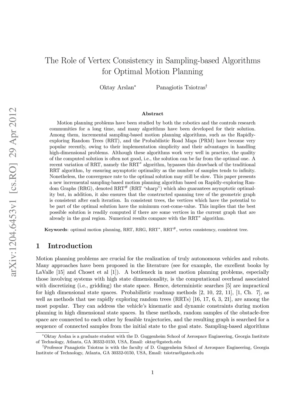 Motion planning problems have been studied by both the robotics and the controls research communities for a long time, and many algorithms have been developed for their solution. Among them, incremental sampling-based motion planning algorithms, such as the Rapidly-exploring Random Trees (RRTs), and the Probabilistic Road Maps (PRMs) have become very popular recently, owing to their implementation simplicity and their advantages in handling high-dimensional problems. Although these algorithms work very well in practice, the quality of the computed solution is often not good, i.e., the solution can be far from the optimal one. A recent variation of RRT, namely the RRT* algorithm, bypasses this drawback of the traditional RRT algorithm, by ensuring asymptotic optimality as the number of samples tends to infinity. Nonetheless, the convergence rate to the optimal solution may still be slow. This paper presents a new incremental sampling-based motion planning algorithm based on Rapidly-exploring Random Graphs (RRG), denoted RRT# (RRT "sharp") which also guarantees asymptotic optimality but, in addition, it also ensures that the constructed spanning tree of the geometric graph is consistent after each iteration. In consistent trees, the vertices which have the potential to be part of the optimal solution have the minimum cost-come-value. This implies that the best possible solution is readily computed if there are some vertices in the current graph that are already in the goal region. Numerical results compare with the RRT* algorithm.