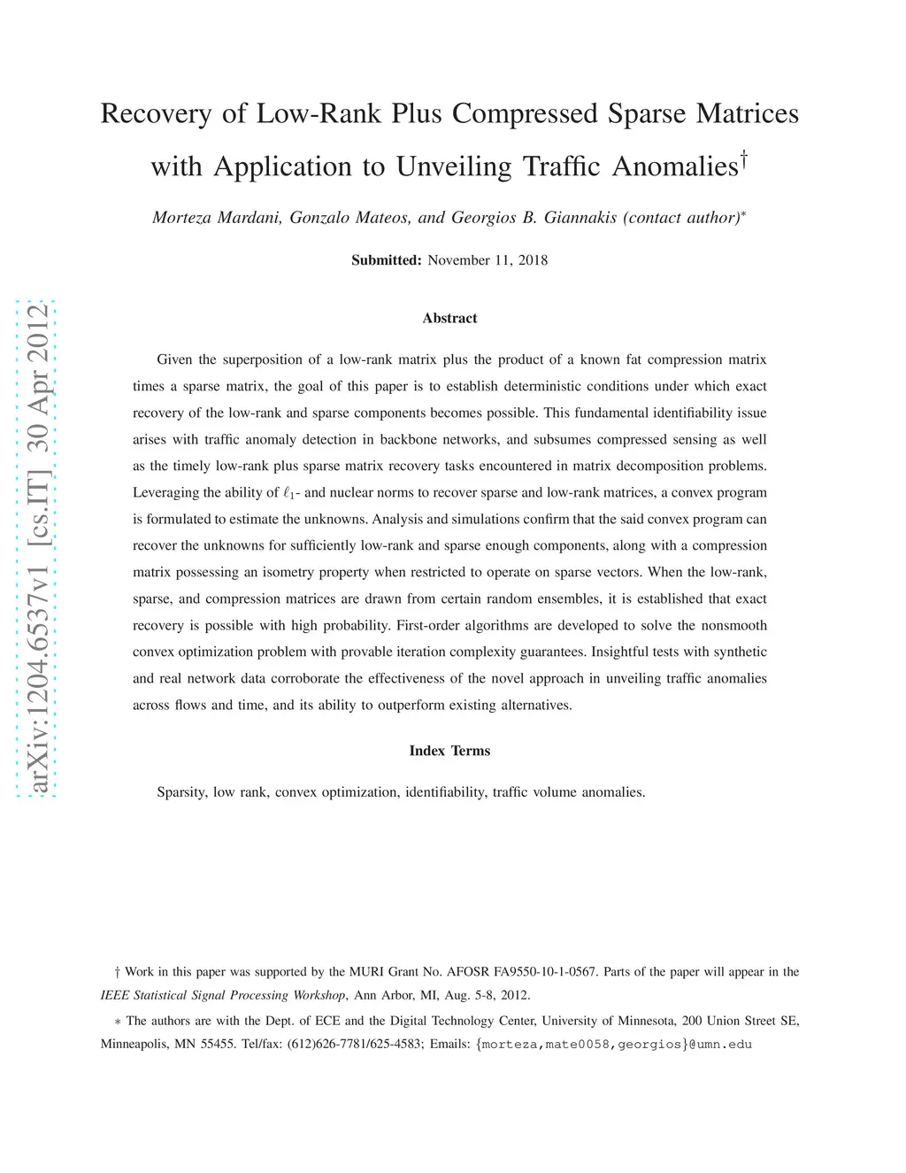 Given the superposition of a low-rank matrix plus the product of a known fat compression matrix times a sparse matrix, the goal of this paper is to establish deterministic conditions under which exact recovery of the low-rank and sparse components becomes possible. This fundamental identifiability issue arises with traffic anomaly detection in backbone networks, and subsumes compressed sensing as well as the timely low-rank plus sparse matrix recovery tasks encountered in matrix decomposition problems. Leveraging the ability of - and nuclear norms to recover sparse and low-rank matrices, a convex program is formulated to estimate the unknowns. Analysis and simulations confirm that the said convex program can recover the unknowns for sufficiently low-rank and sparse enough components, along with a compression matrix possessing an isometry property when restricted to operate on sparse vectors. When the low-rank, sparse, and compression matrices are drawn from certain random ensembles, it is established that exact recovery is possible with high probability. First-order algorithms are developed to solve the nonsmooth convex optimization problem with provable iteration complexity guarantees. Insightful tests with synthetic and real network data corroborate the effectiveness of the novel approach in unveiling traffic anomalies across flows and time, and its ability to outperform existing alternatives.