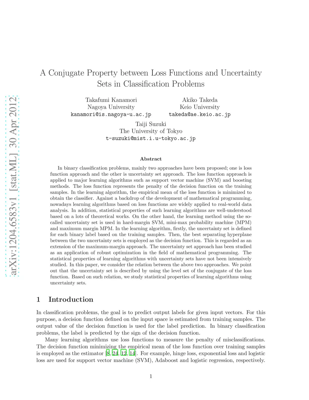 In binary classification problems, mainly two approaches have been proposed; one is loss function approach and the other is uncertainty set approach. The loss function approach is applied to major learning algorithms such as support vector machine (SVM) and boosting methods. The loss function represents the penalty of the decision function on the training samples. In the learning algorithm, the empirical mean of the loss function is minimized to obtain the classifier. Against a backdrop of the development of mathematical programming, nowadays learning algorithms based on loss functions are widely applied to real-world data analysis. In addition, statistical properties of such learning algorithms are well-understood based on a lots of theoretical works. On the other hand, the learning method using the so-called uncertainty set is used in hard-margin SVM, mini-max probability machine (MPM) and maximum margin MPM. In the learning algorithm, firstly, the uncertainty set is defined for each binary label based on the training samples. Then, the best separating hyperplane between the two uncertainty sets is employed as the decision function. This is regarded as an extension of the maximum-margin approach. The uncertainty set approach has been studied as an application of robust optimization in the field of mathematical programming. The statistical properties of learning algorithms with uncertainty sets have not been intensively studied. In this paper, we consider the relation between the above two approaches. We point out that the uncertainty set is described by using the level set of the conjugate of the loss function. Based on such relation, we study statistical properties of learning algorithms using uncertainty sets.