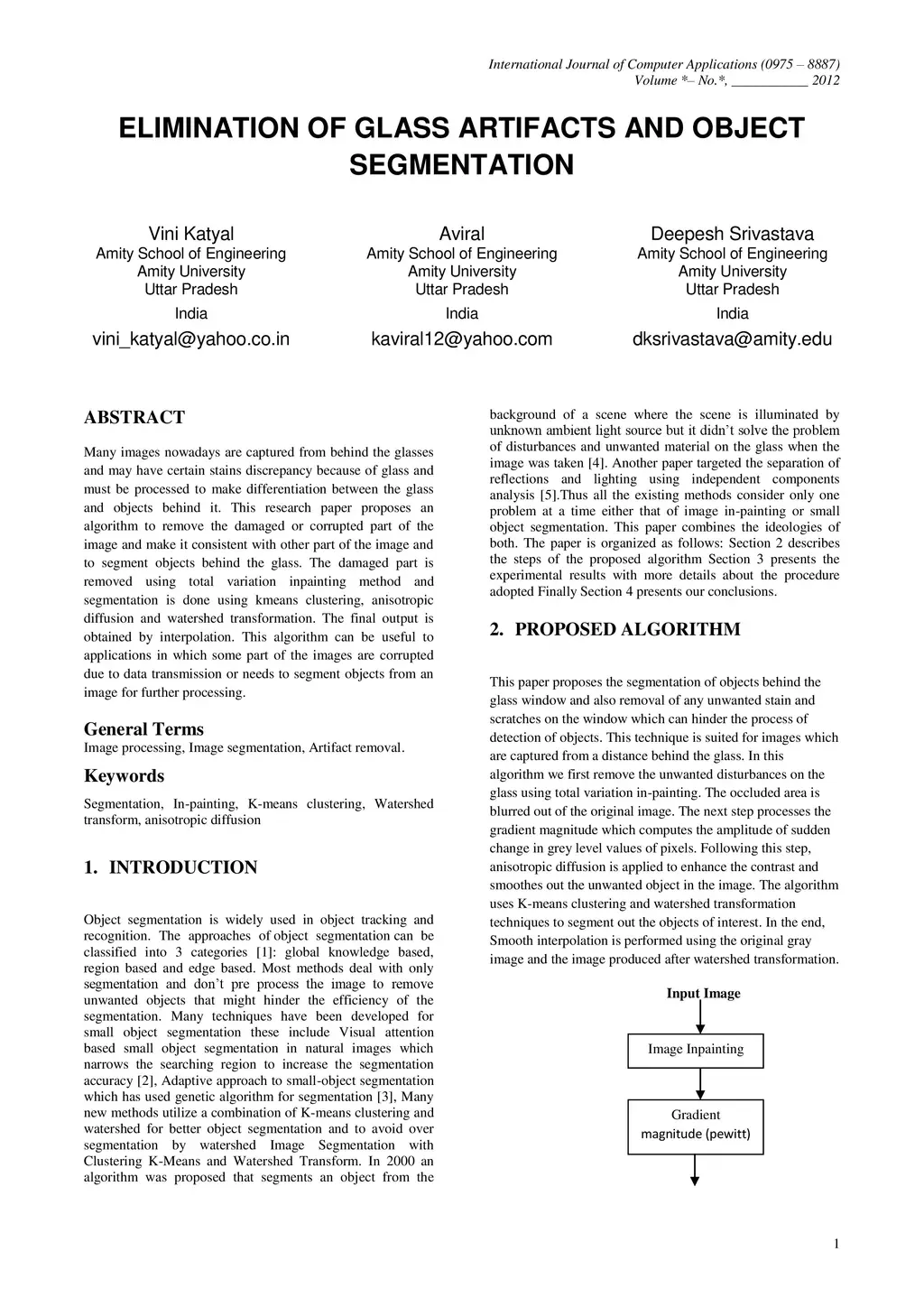 Many images nowadays are captured from behind the glasses and may have certain stains discrepancy because of glass and must be processed to make differentiation between the glass and objects behind it. This research paper proposes an algorithm to remove the damaged or corrupted part of the image and make it consistent with other part of the image and to segment objects behind the glass. The damaged part is removed using total variation inpainting method and segmentation is done using kmeans clustering, anisotropic diffusion and watershed transformation. The final output is obtained by interpolation. This algorithm can be useful to applications in which some part of the images are corrupted due to data transmission or needs to segment objects from an image for further processing.