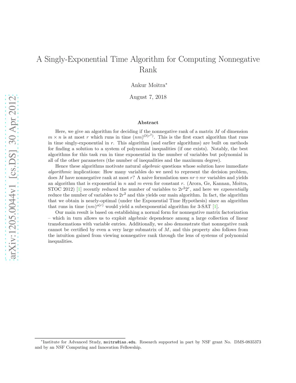 Here, we give an algorithm for deciding if the nonnegative rank of a matrix of dimension is at most which runs in time . This is the first exact algorithm that runs in time singly-exponential in . This algorithm (and earlier algorithms) are built on methods for finding a solution to a system of polynomial inequalities (if one exists). Notably, the best algorithms for this task run in time exponential in the number of variables but polynomial in all of the other parameters (the number of inequalities and the maximum degree). Hence these algorithms motivate natural algebraic questions whose solution have immediate {\em algorithmic} implications: How many variables do we need to represent the decision problem, does have nonnegative rank at most ? A naive formulation uses variables and yields an algorithm that is exponential in and even for constant . (Arora, Ge, Kannan, Moitra, STOC 2012) recently reduced the number of variables to , and here we exponentially reduce the number of variables to and this yields our main algorithm. In fact, the algorithm that we obtain is nearly-optimal (under the Exponential Time Hypothesis) since an algorithm that runs in time would yield a subexponential algorithm for 3-SAT . Our main result is based on establishing a normal form for nonnegative matrix factorization - which in turn allows us to exploit algebraic dependence among a large collection of linear transformations with variable entries. Additionally, we also demonstrate that nonnegative rank cannot be certified by even a very large submatrix of , and this property also follows from the intuition gained from viewing nonnegative rank through the lens of systems of polynomial inequalities.