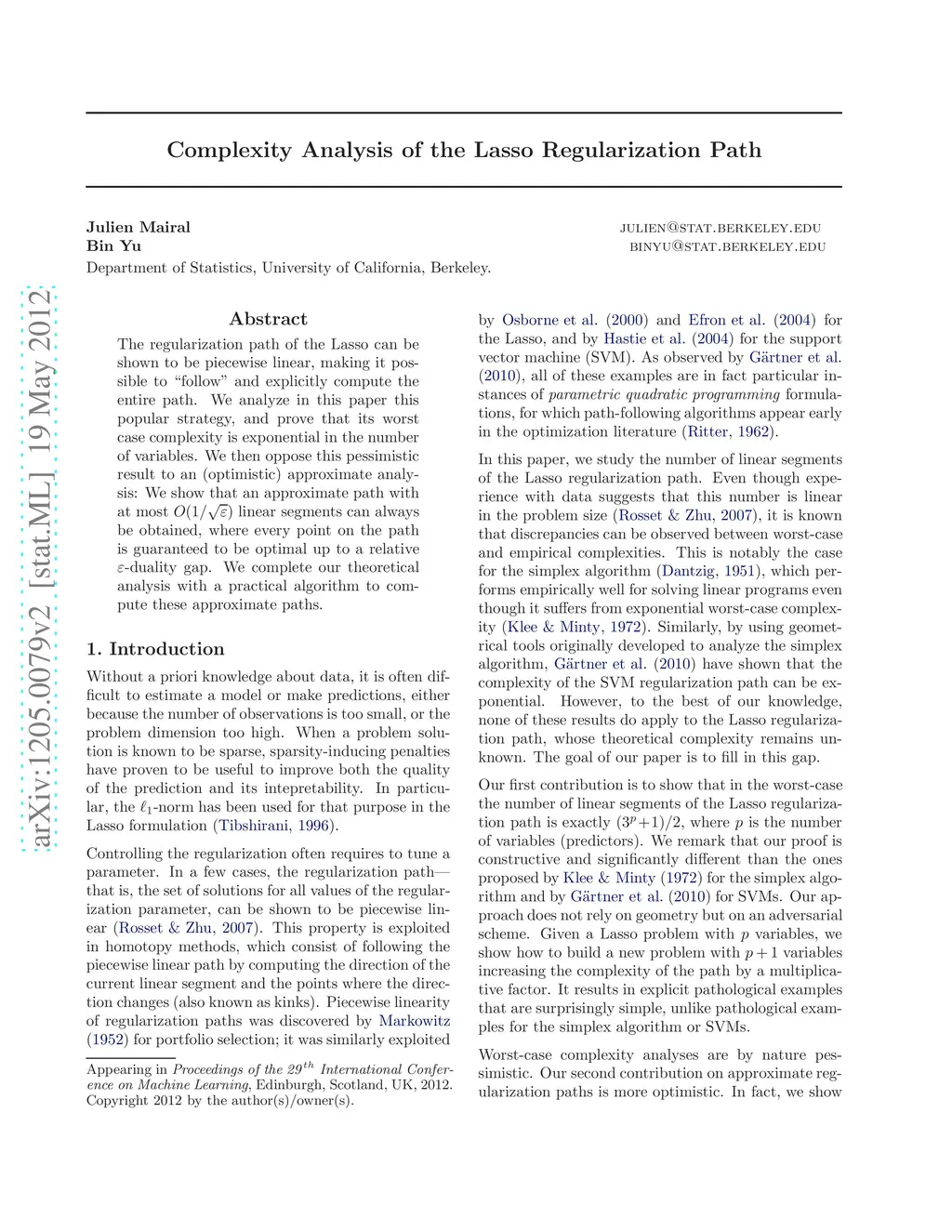 The regularization path of the Lasso can be shown to be piecewise linear, making it possible to "follow" and explicitly compute the entire path. We analyze in this paper this popular strategy, and prove that its worst case complexity is exponential in the number of variables. We then oppose this pessimistic result to an (optimistic) approximate analysis: We show that an approximate path with at most O(1/sqrt(epsilon)) linear segments can always be obtained, where every point on the path is guaranteed to be optimal up to a relative epsilon-duality gap. We complete our theoretical analysis with a practical algorithm to compute these approximate paths.