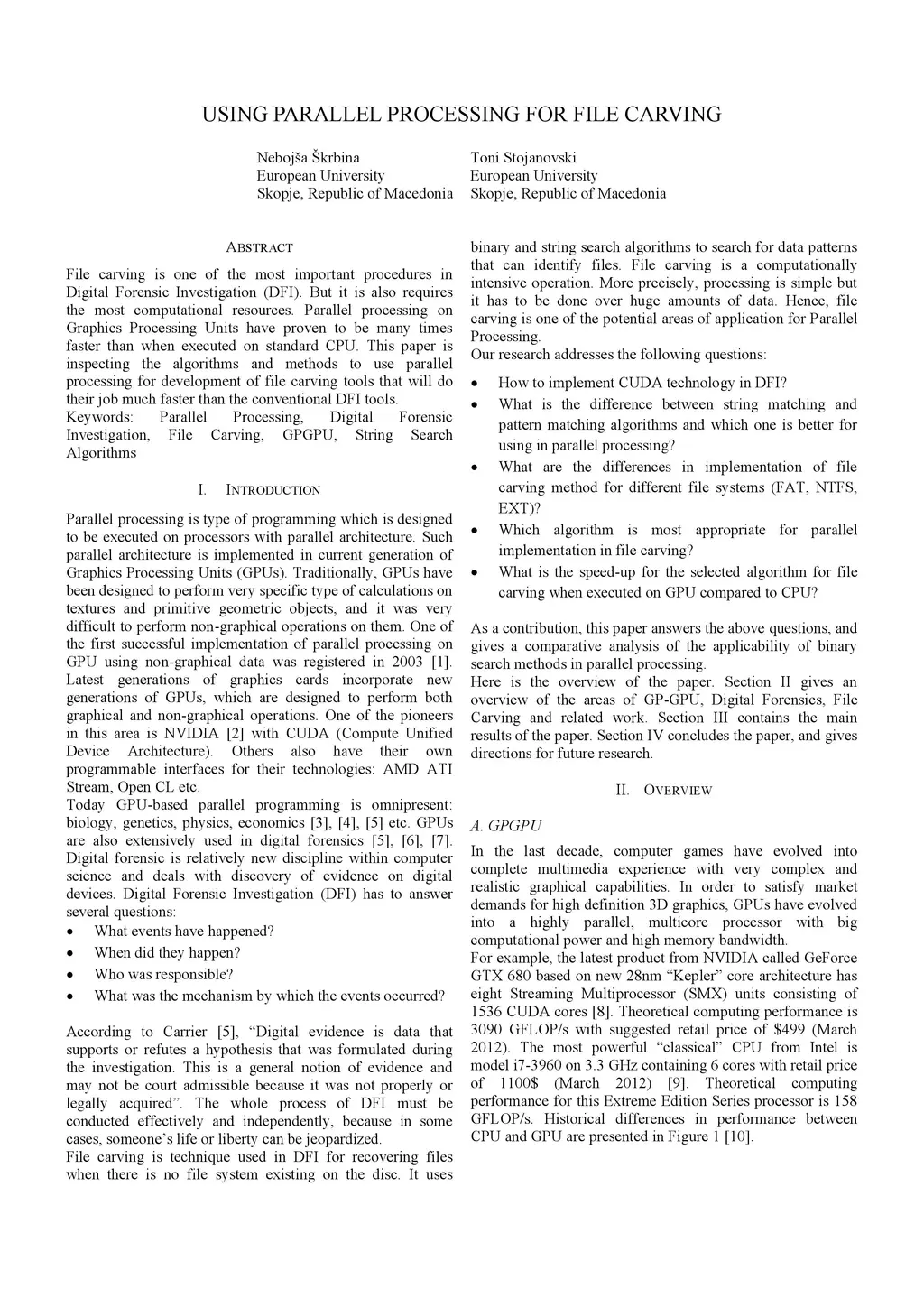 File carving is one of the most important procedures in Digital Forensic Investigation (DFI). But it is also requires the most computational resources. Parallel processing on Graphics Processing Units have proven to be many times faster than when executed on standard CPU. This paper is inspecting the algorithms and methods to use parallel processing for development of file carving tools that will do their job much faster than the conventional DFI tools.