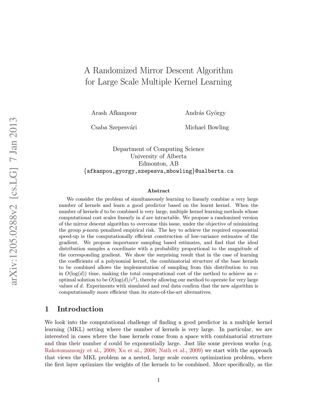 A Randomized Mirror Descent Algorithm for Large Scale Multiple Kernel
