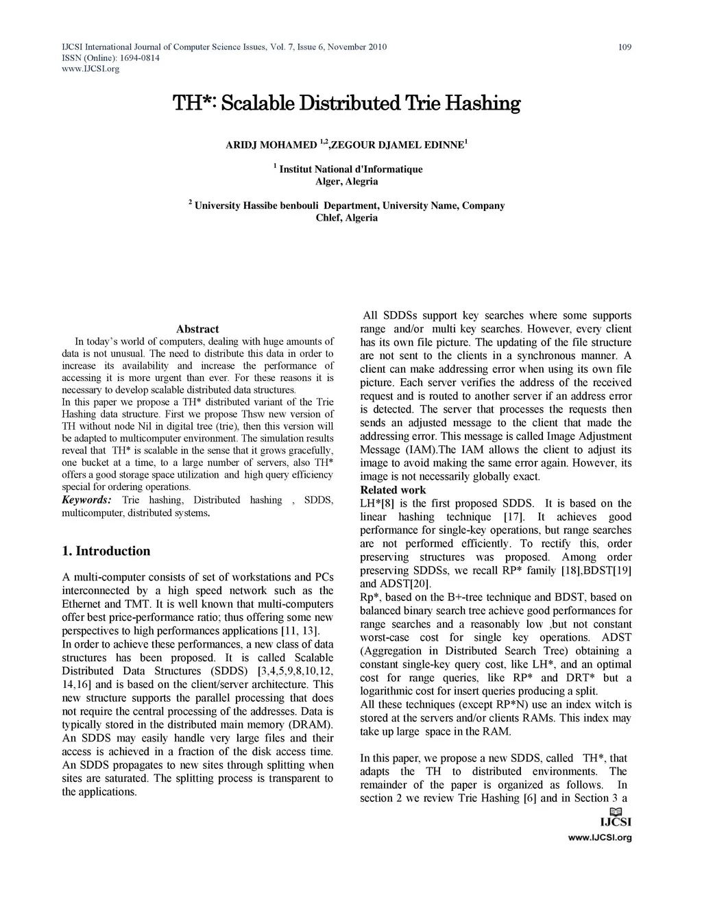 In today's world of computers, dealing with huge amounts of data is not unusual. The need to distribute this data in order to increase its availability and increase the performance of accessing it is more urgent than ever. For these reasons it is necessary to develop scalable distributed data structures. In this paper we propose a TH* distributed variant of the Trie Hashing data structure. First we propose Thsw new version of TH without node Nil in digital tree (trie), then this version will be adapted to multicomputer environment. The simulation results reveal that TH* is scalable in the sense that it grows gracefully, one bucket at a time, to a large number of servers, also TH* offers a good storage space utilization and high query efficiency special for ordering operations.